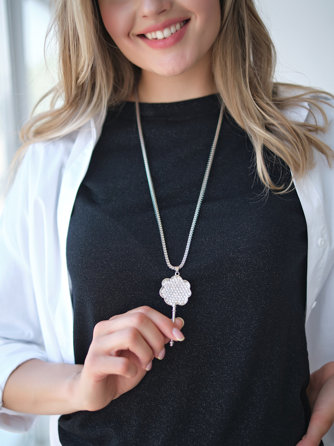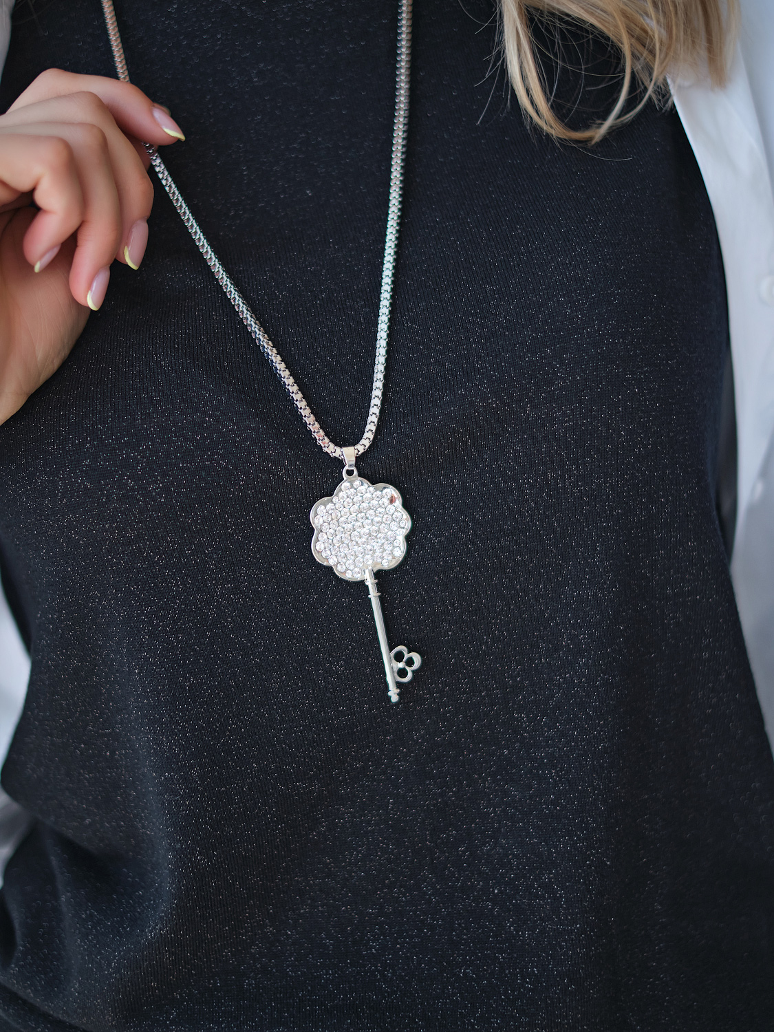 Стильная подвеска в виде ключа. Выполнена из комбинированных материалов, богато украшена стразами.