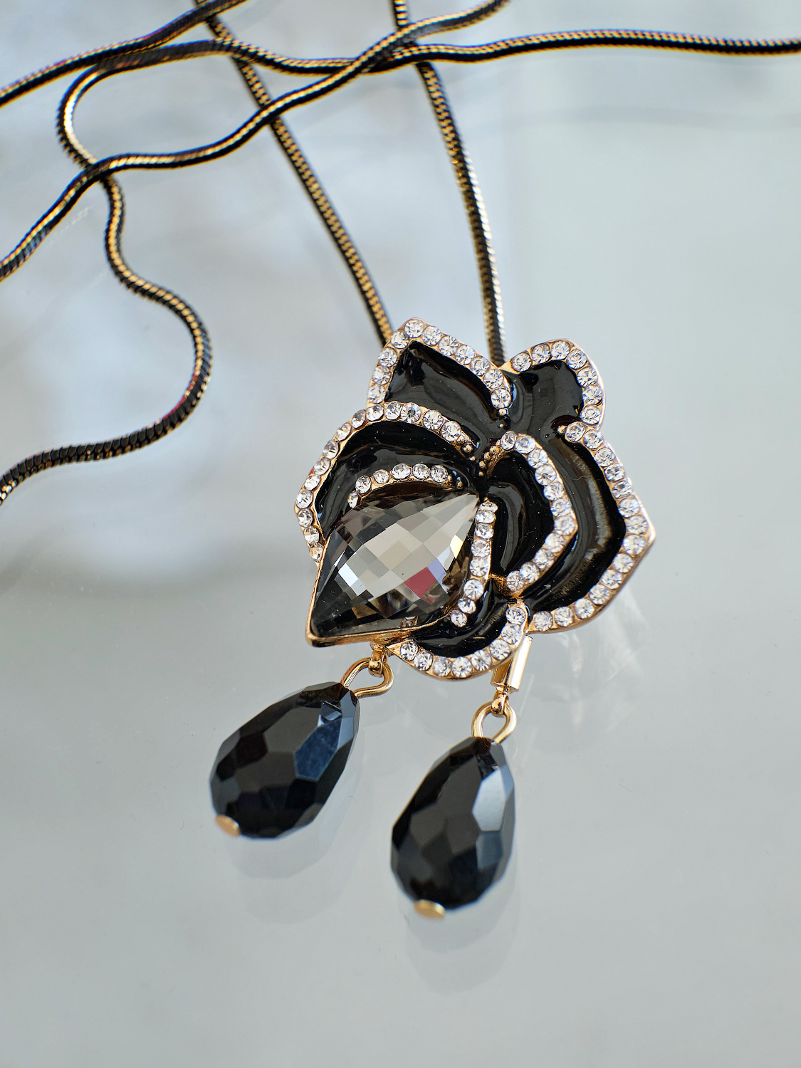 Стильная подвеска в виде цветка. Выполнена из комбинированных материалов с использованием горного хрусталя.