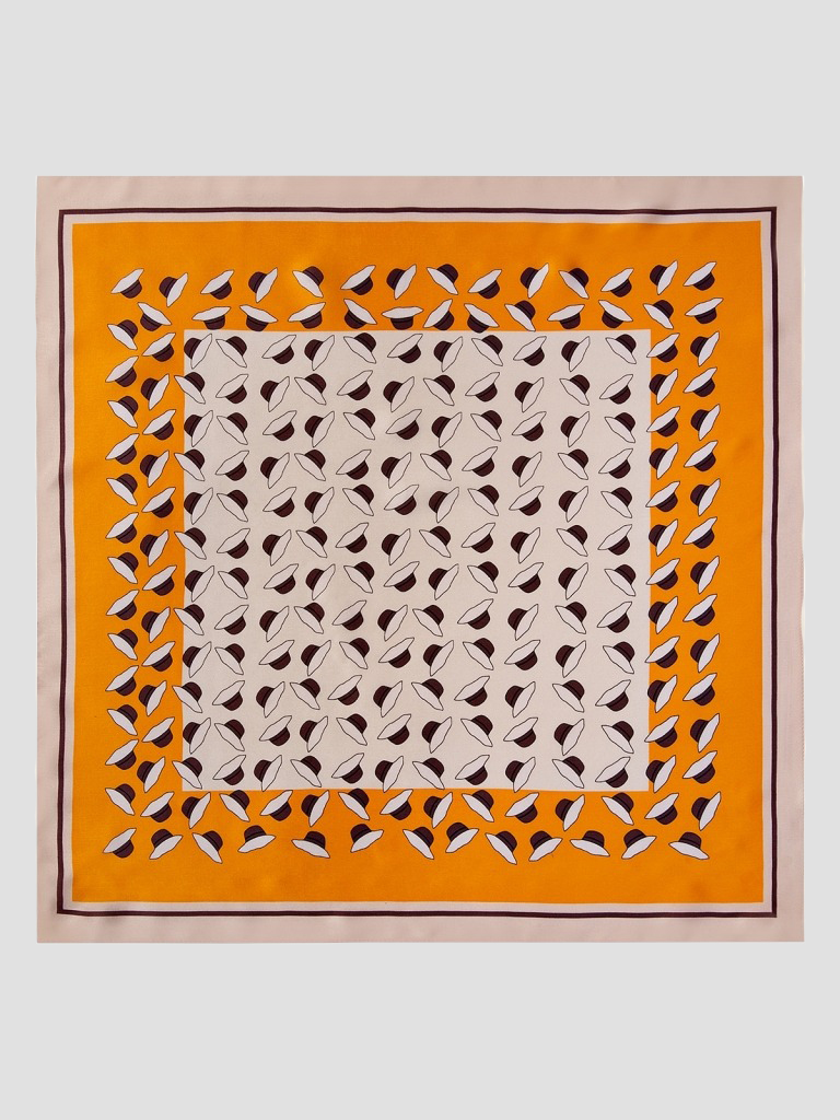 Платок с принтом из 100% шёлка. Тип плетения: Сатин. Размер: 53х53 см. Машинная подгибка.