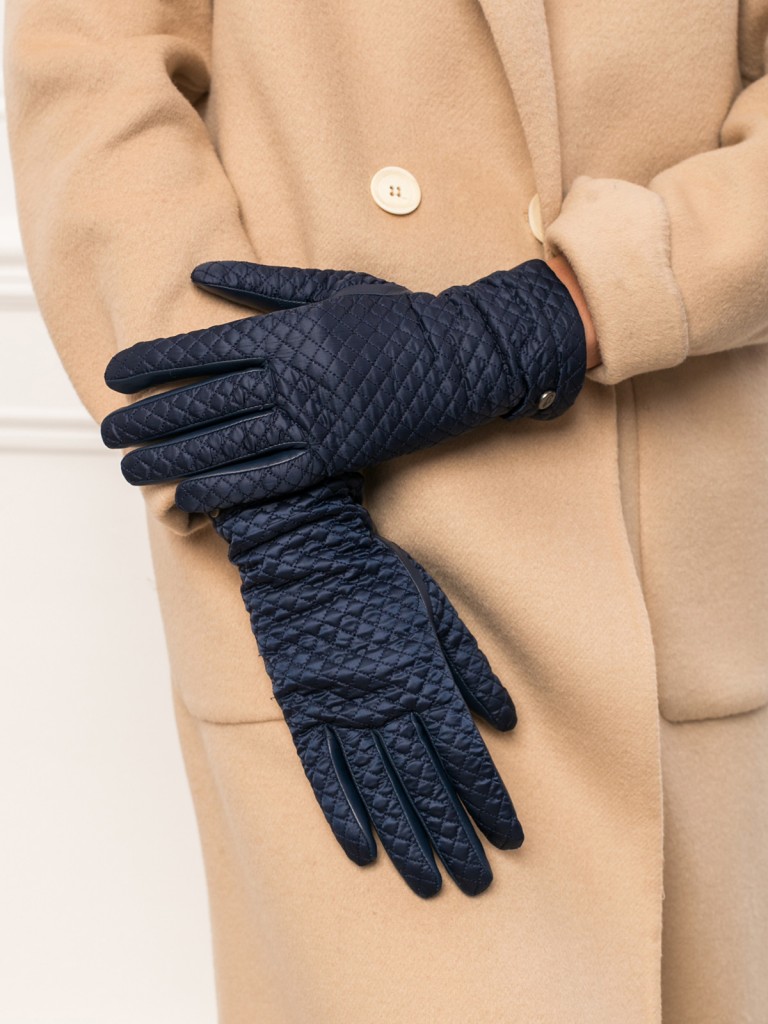 Перчатки из натуральной кожи ягненка. Подкладка: 70% шерсть, 30% акрил. Отделка - лицевая сторона выполнена из 100% полиэстера с симметричными декоративными строчками. Длина манжеты от нижней точки большого пальца до края перчаток - 6.5 см. Длина пальцев - средняя.