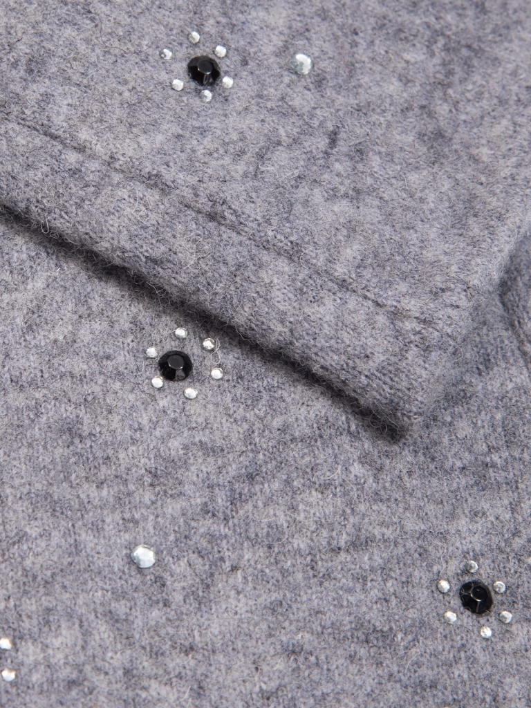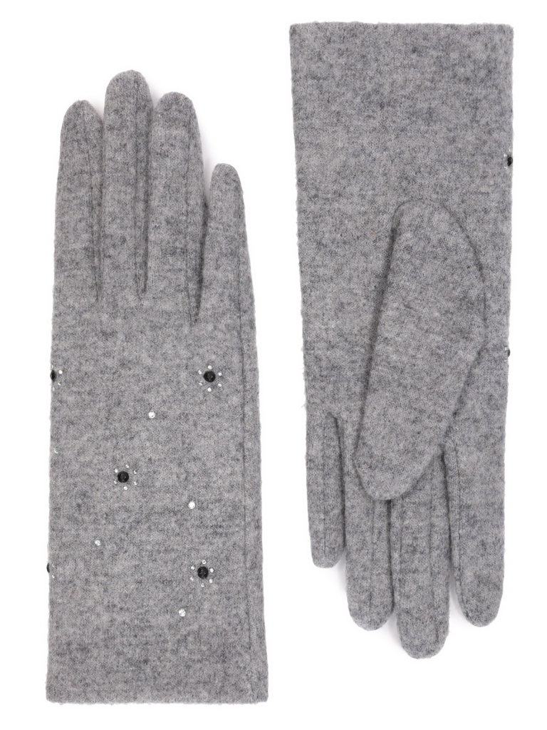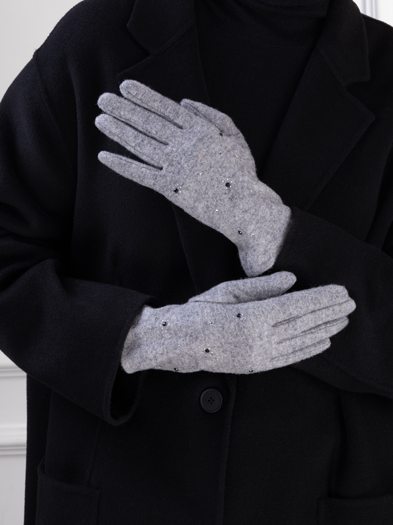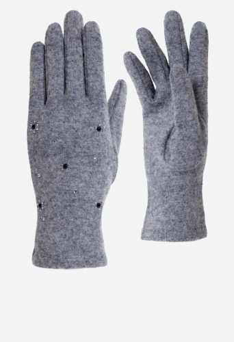 Перчатки выполнены из трикотажной шерсти. Состав трикотажа: 80% шерсть, 20% нейлон. Без подкладки. На лицевой стороне перчатки декоративная отделка из мелких страз в виде цветочков. Длина манжеты от нижней точки большого пальца до края перчатки 6,5 см. Длина пальцев - средняя.