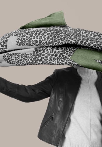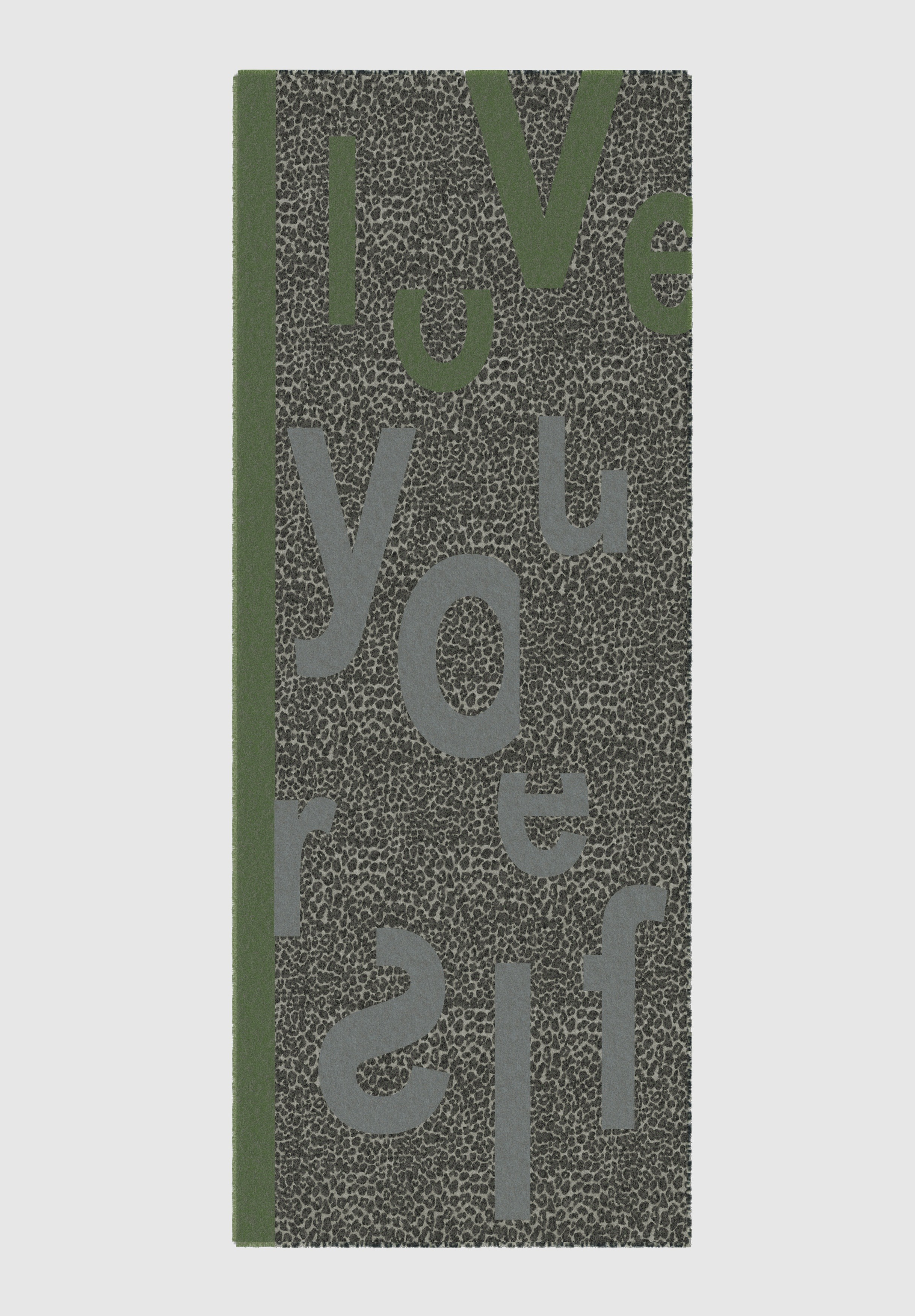 Стильный прямоугольный шарф в виде животных с надписью и зелеными акцентами. Размер примерно 70 х 180 см.