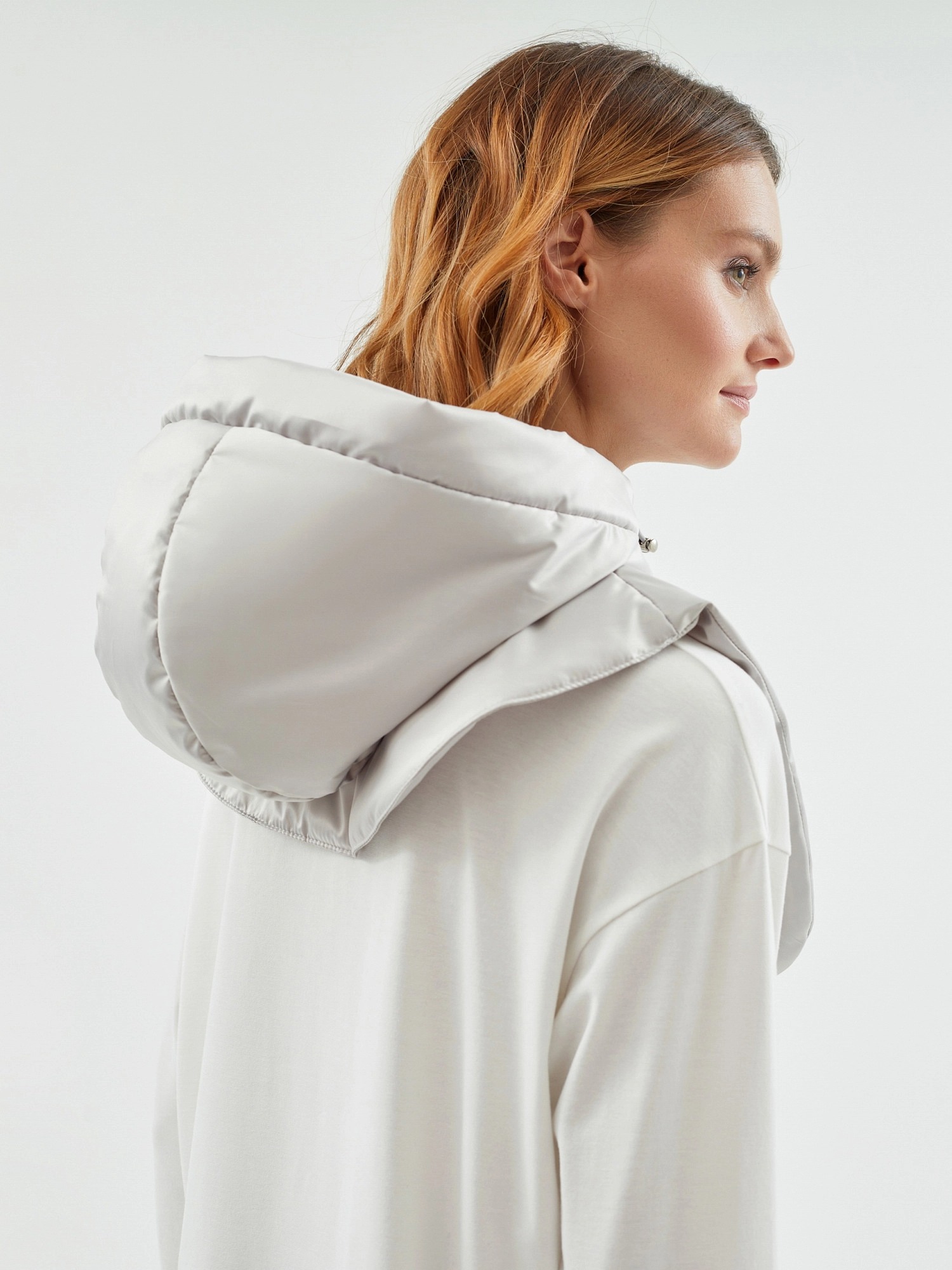 Съемный капюшон с манишкой из плащевой ткани серебристого цвета. Капюшон на молнии, имеет резинку и два фиксатора для регулирования объема капюшона. Капюшон очень теплый, внутрь встроены непродуваемая мембрана и утеплитель для защиты от ветра и дождя.