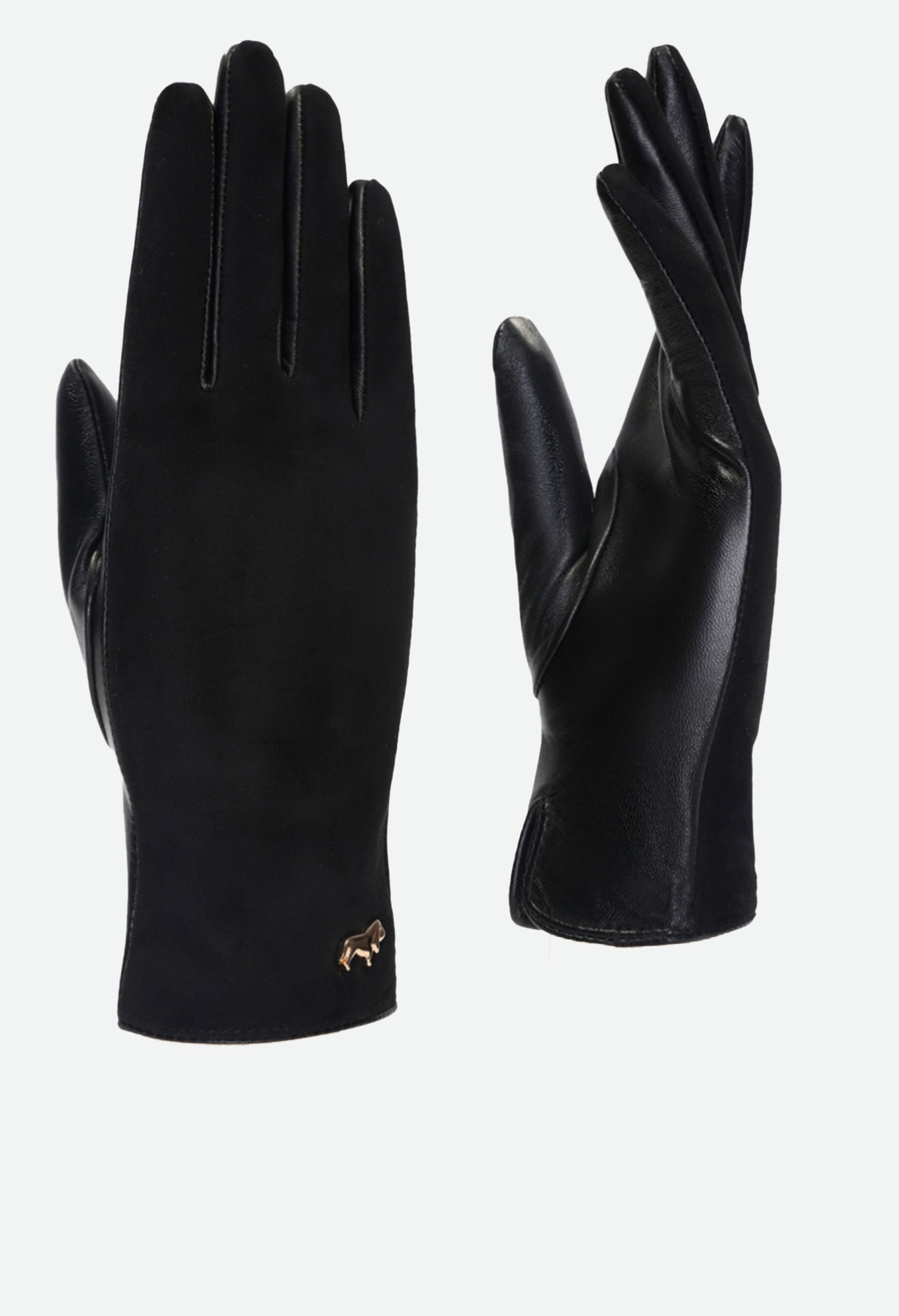Перчатки из натуральной кожи ягненка. Подкладка: 70% шерсть, 30% акрил. Отделка - лицевая сторона перчатки выполнена из натурального велюра, фирменная фурнитура в виде собачки. Длина манжеты от нижней точки большого пальца до края перчаток - 6 см. Длина пальцев - средняя.