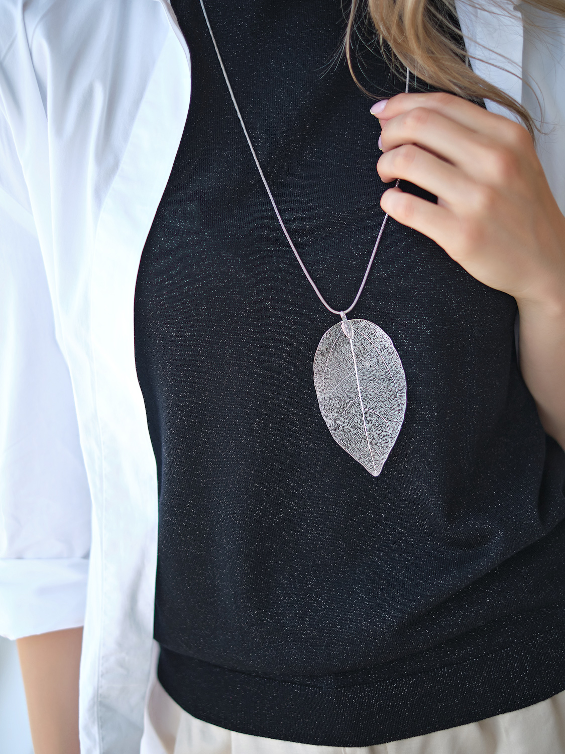 Украшение-подвеска в виде изящного ажурного листа создает утонченный и воздушный образ.