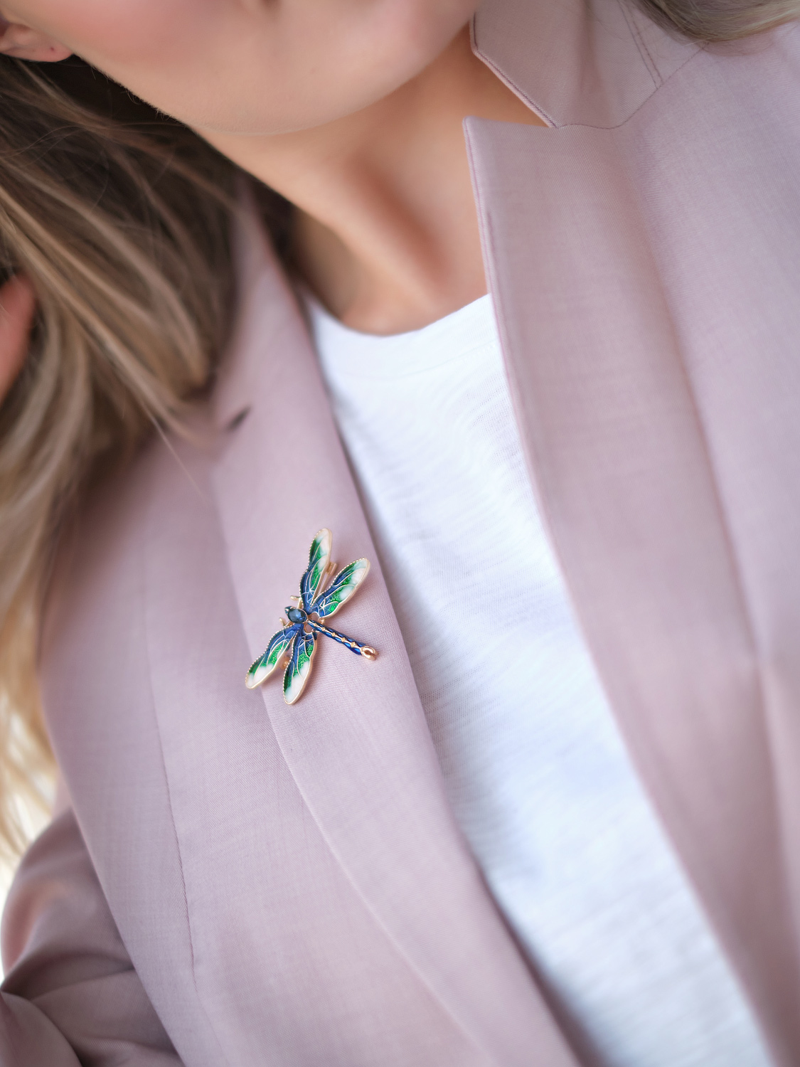 Украшение-брошь в виде стрекозы со вставкой горного хрусталя станет интересным акцентом в повседневном образе.
