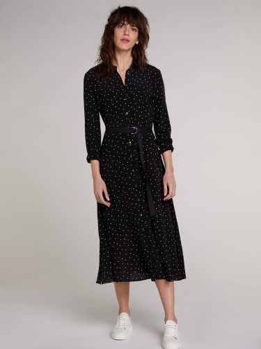 Платье длины макси в мелкий горох. Отложной рубашечный воротник, планка с пуговицами. Втачной рукав полной длины с манжетой. В комплекте идет черный тканевый пояс.