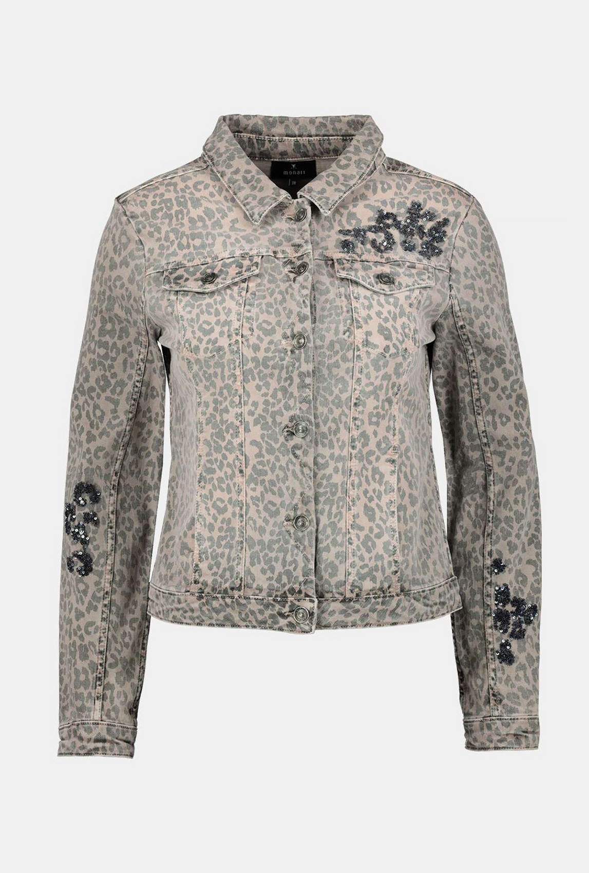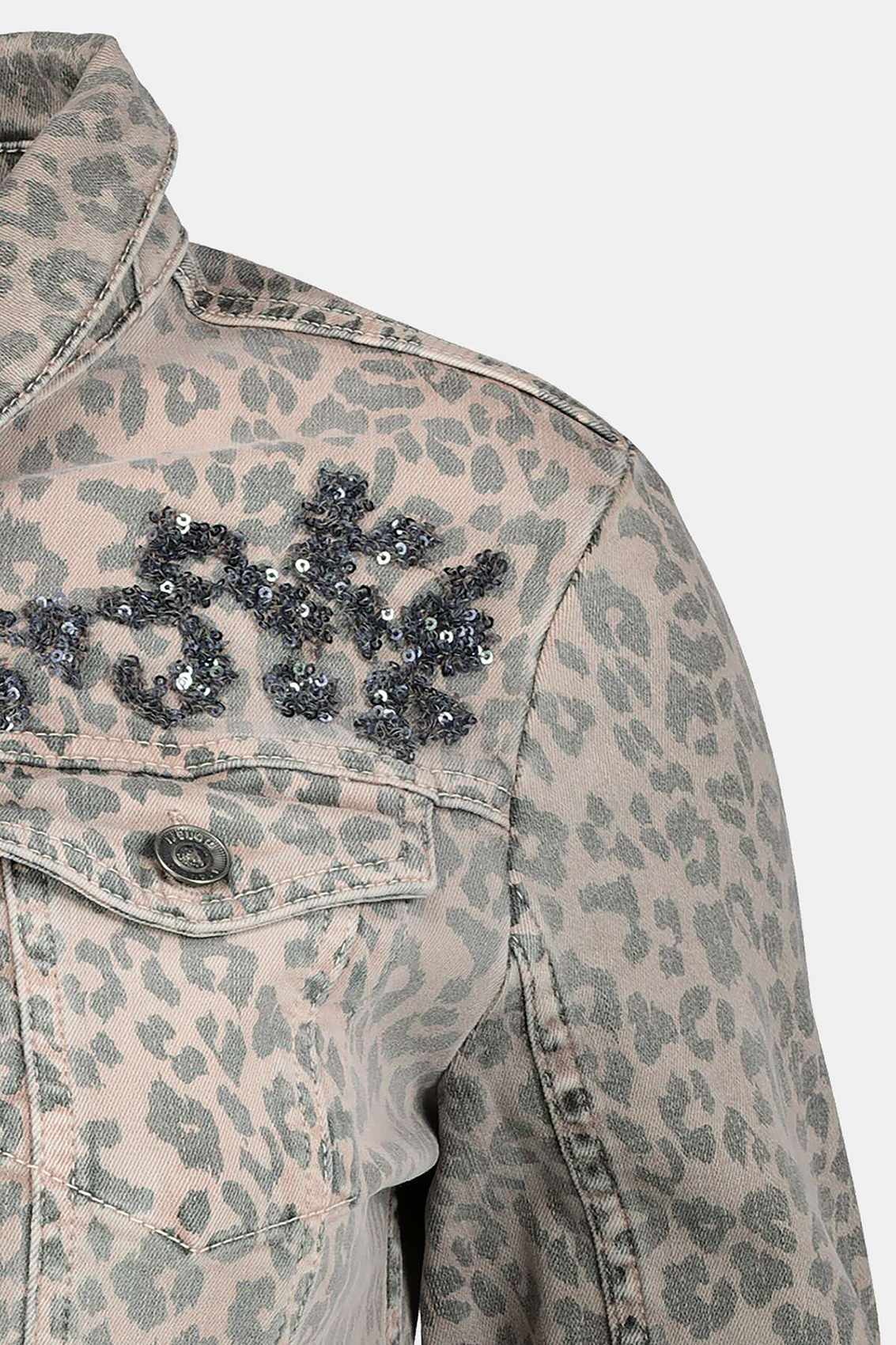 Оригинальная джинсовка с накладными карманами и анималистичным принтом. Эффект запыленности делает джинсовку трендовой. Пайетки создают яркие акценты. Джинсовка застегивается на пуговицы, имеет втачной рукав полной длины.