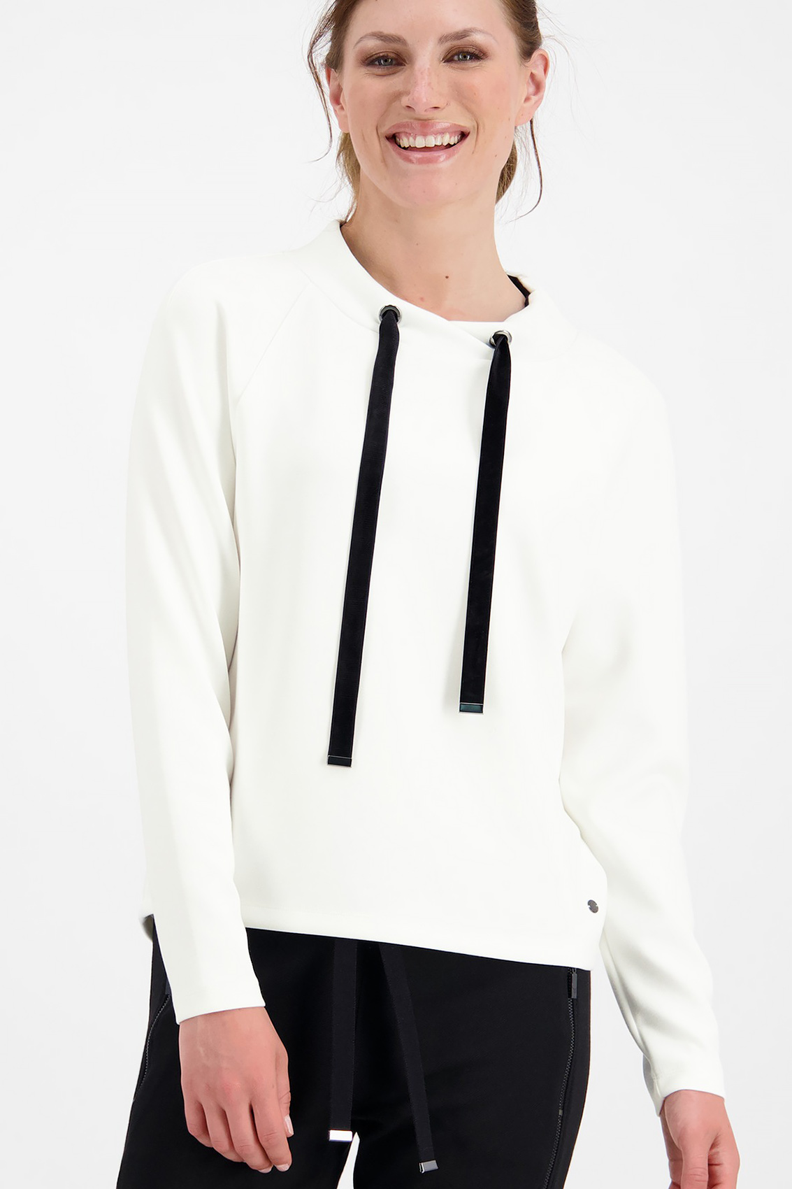 Джемпер из смесовой ткани с воротником стойкой. Воротник джемпера регулирует кулиска с контрастным плоским шнурком. Рукав реглан полной длины. Стильный вариант для спортивного стиля и повседневной носки.