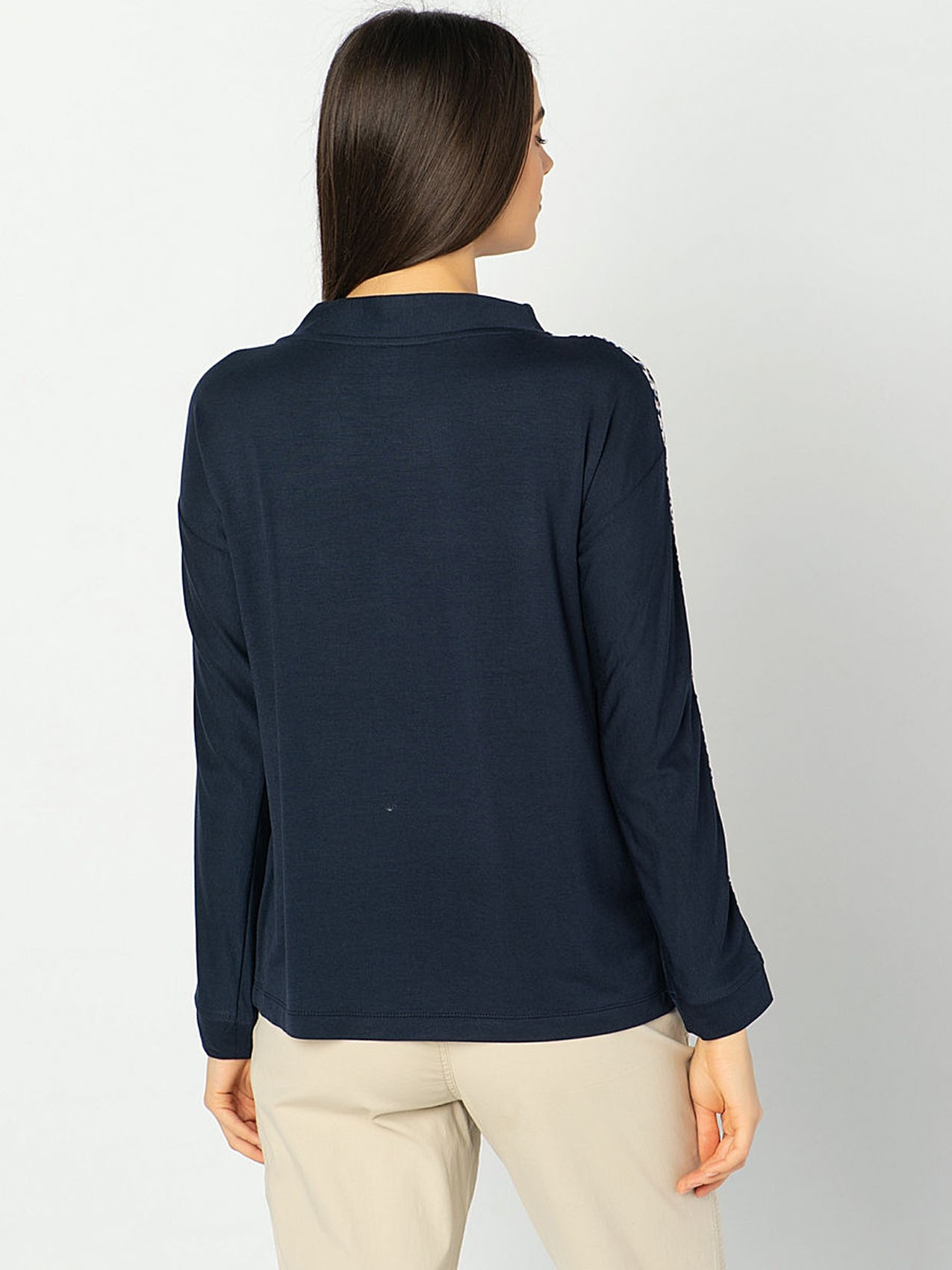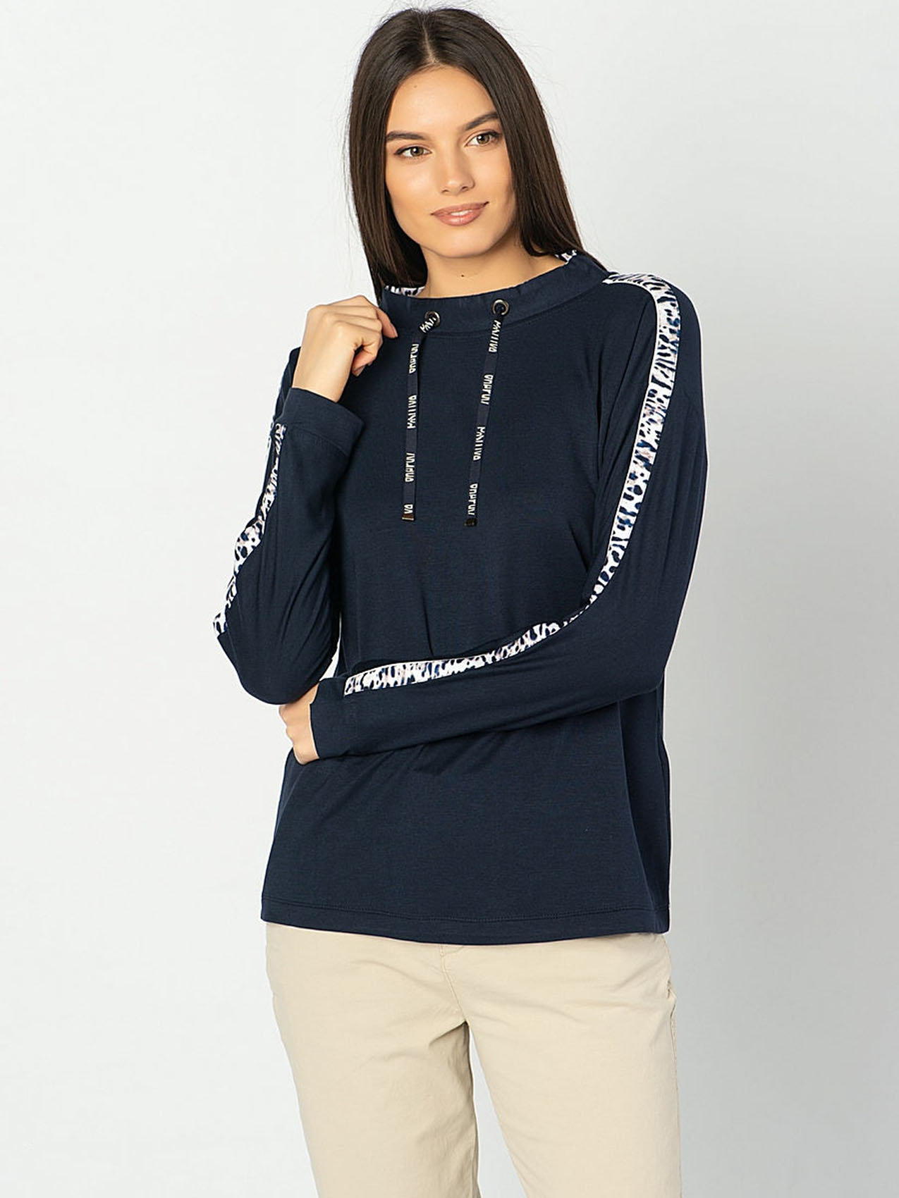 Футболка-лонгслив с манжетами. Приятный к телу материал из смеси вискозы, модала и эластана гарантирует отличную посадку, а прямой крой и рукав с опущенным плечом обеспечивают свободу движений. Полосы на плечах и рукавах и завязки на воротнике завершают дизайн и придают спортивный вид. Интересная деталь дизайна футболки - леопардовый принт на подкладке воротника.