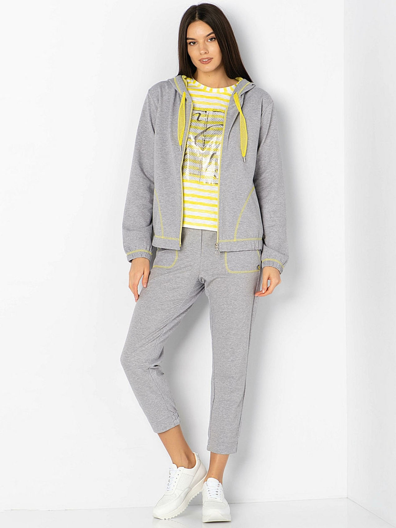 Укороченные спортивные брюки без утепления. Средняя посадка. Эластичная лента на поясе. Прорезные карманы. Яркая декоративная отстрочка. Приятный к телу материал из смеси хлопка и эластана. Длина изделия по внутреннему шву: 73 см.