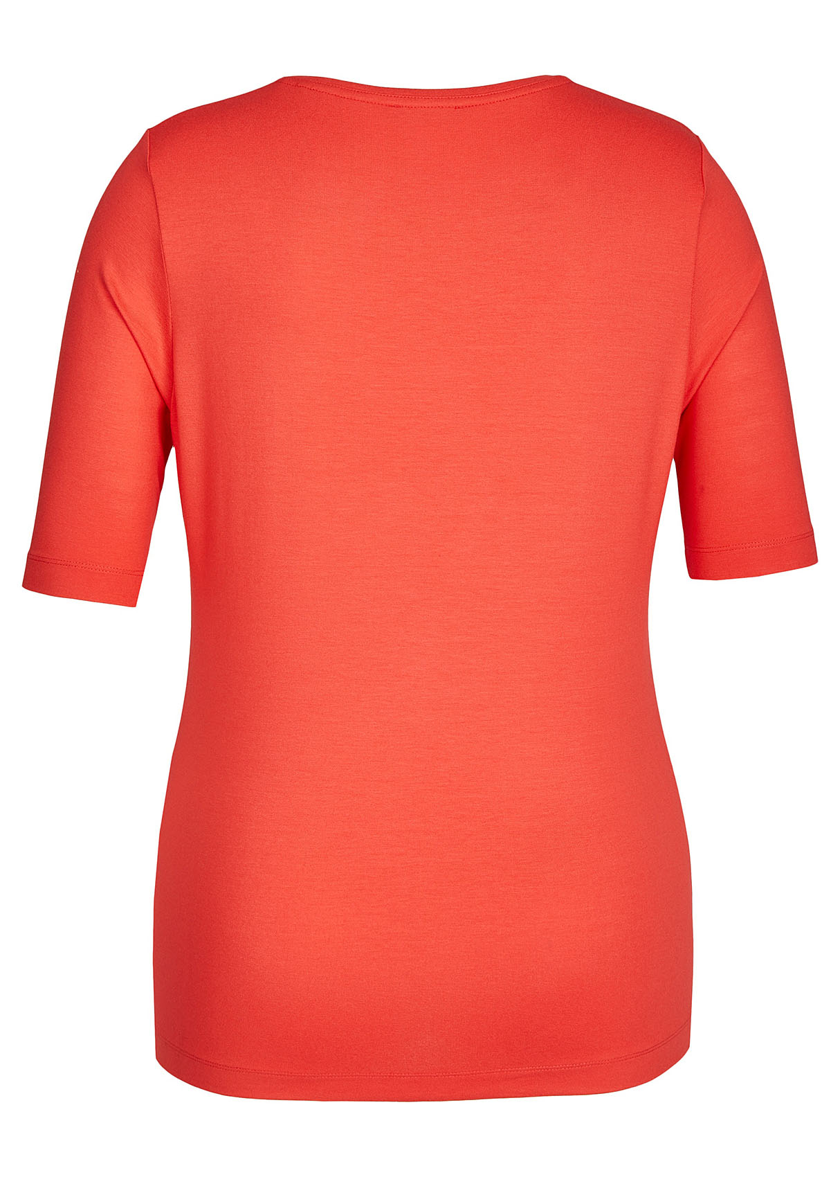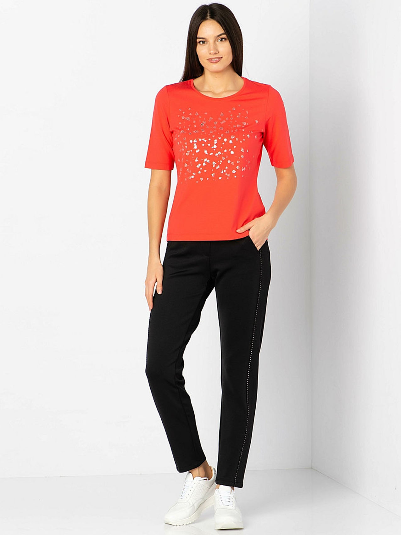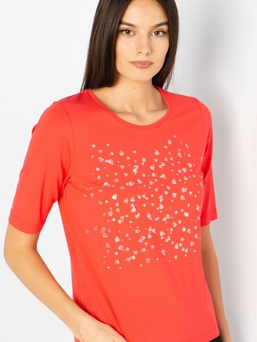 Яркие краски лета - для вас! Футболка трендового цвета с серебристым цветочным принтом. Мягкий материал из смеси вискозы и эластана гарантирует отличную посадку, а рукав 1/2 придает образу легкость и непринужденность. Слегка приталенный силуэт подчеркивает женственность. Универсальная футболка прекрасно смотрится как с классическим костюмом, так и со спортивным.
