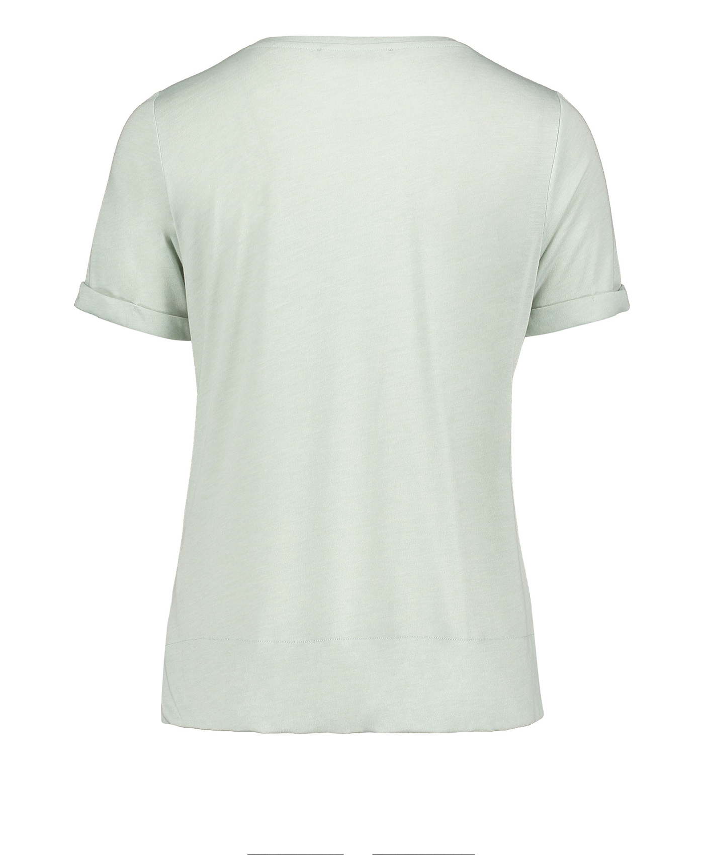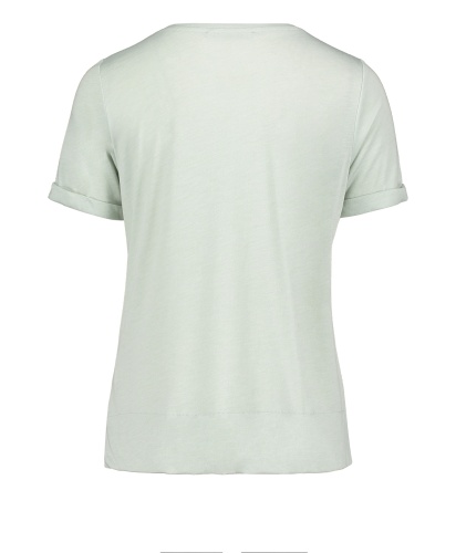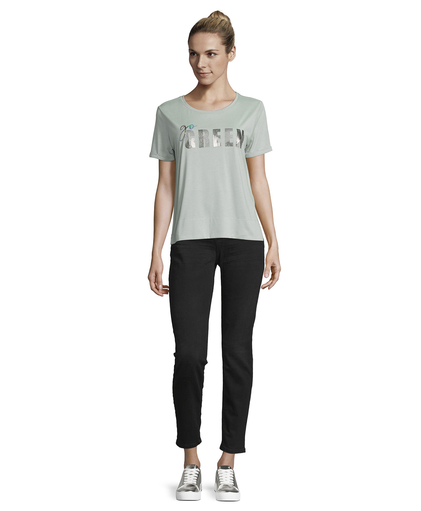 Футболка слегка приталенного силуэта подчеркивает достоинства фигуры. Круглый вырез горловины, короткие рукава с фиксированными манжетами. Металлизированный принт с надписью. Эта универсальная модель будет отлично смотреться как с брюками, так и с юбкой.