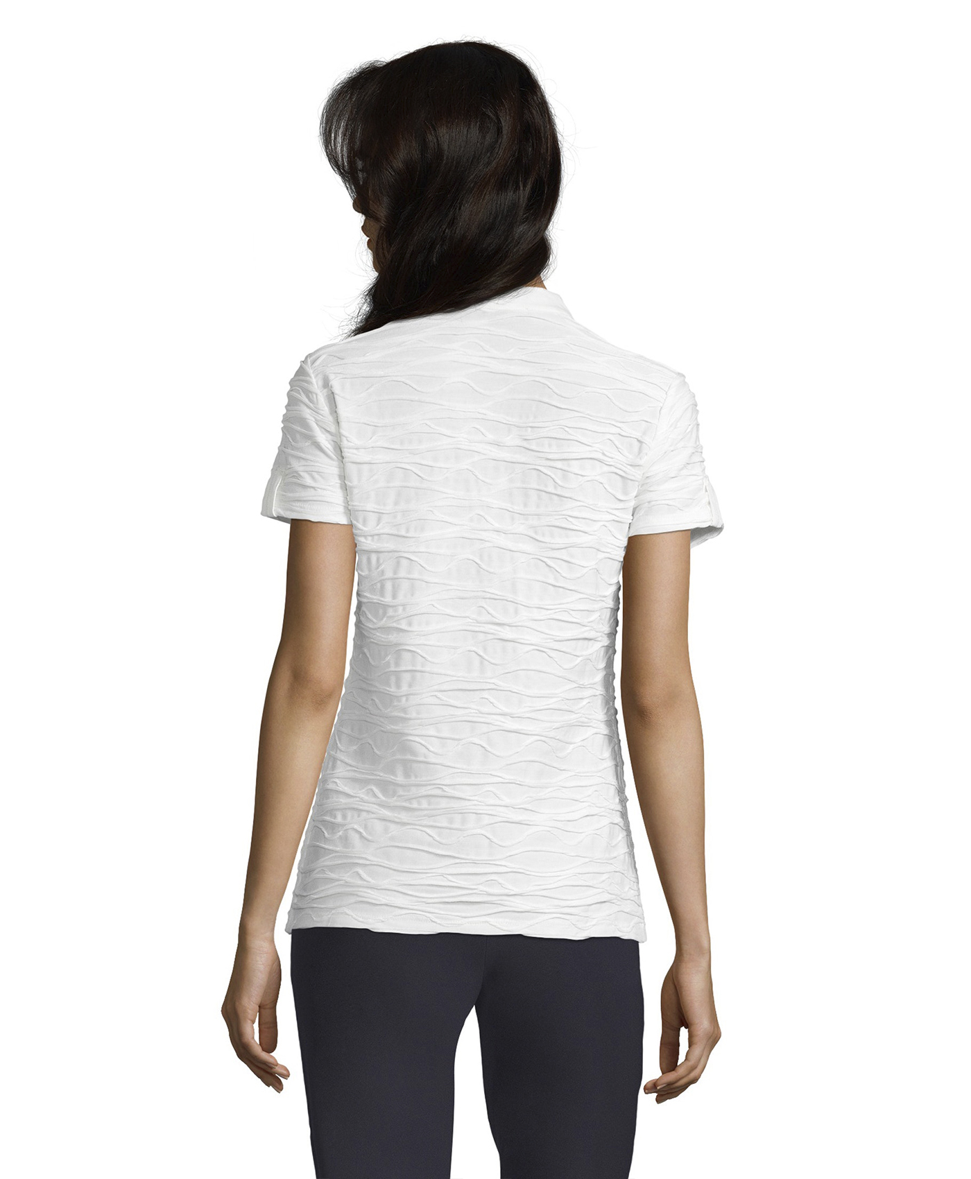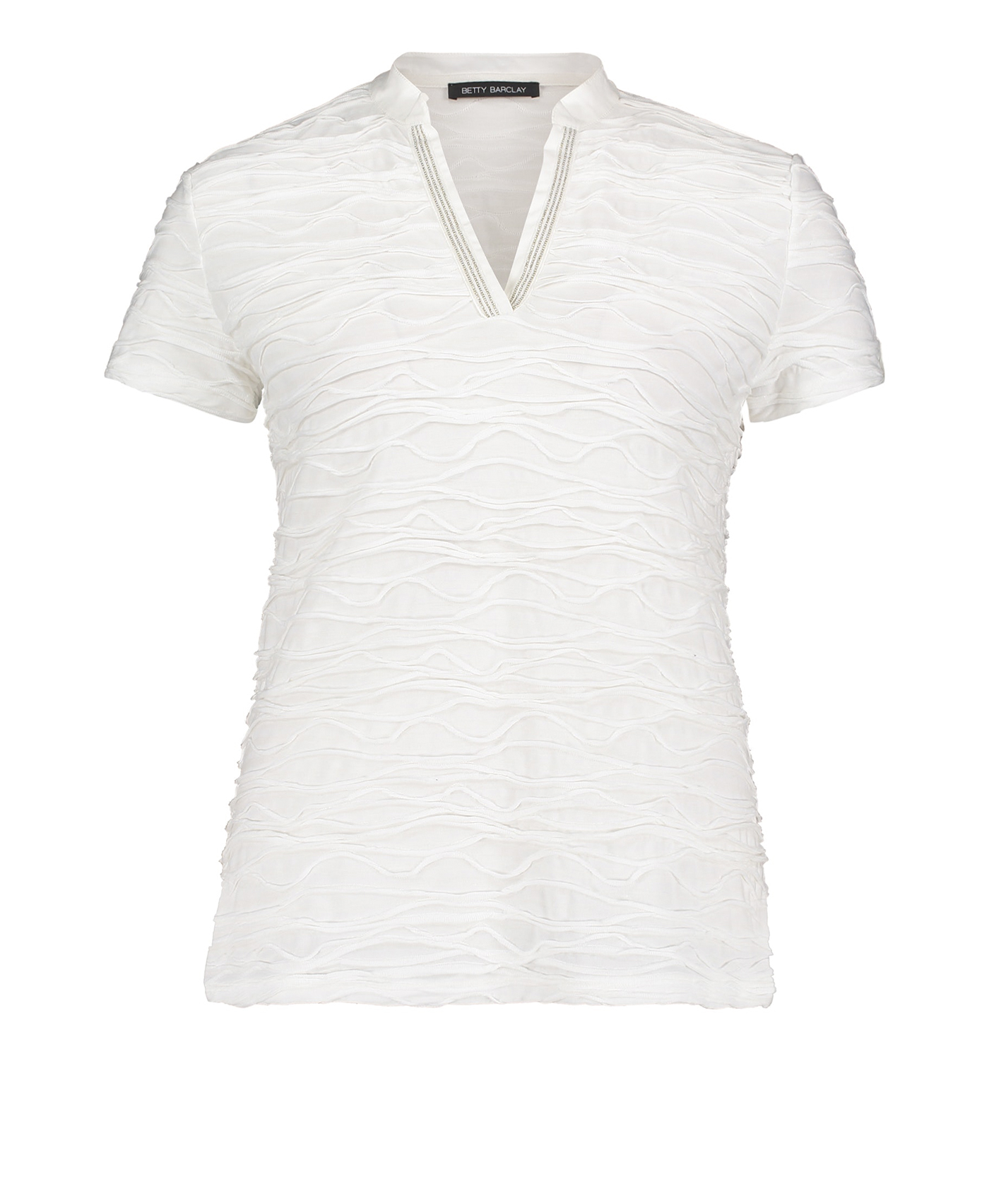 Однотонная футболка прямого покроя - абсолютно необходимая вещь в гардеробе. Короткие рукава, V-образный вырез горловины с отделкой тесьмой. Интересная фактура ткани привлекает внимание. Футболка отлично сочетается как с брюками, так и с юбкой.