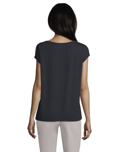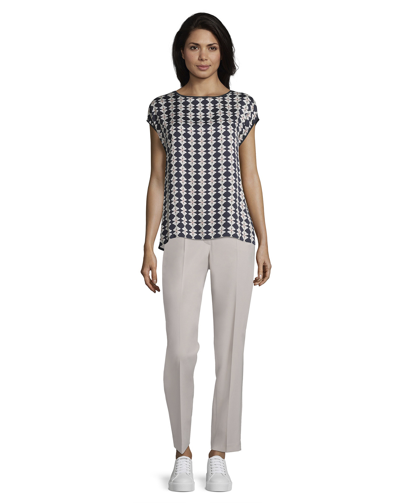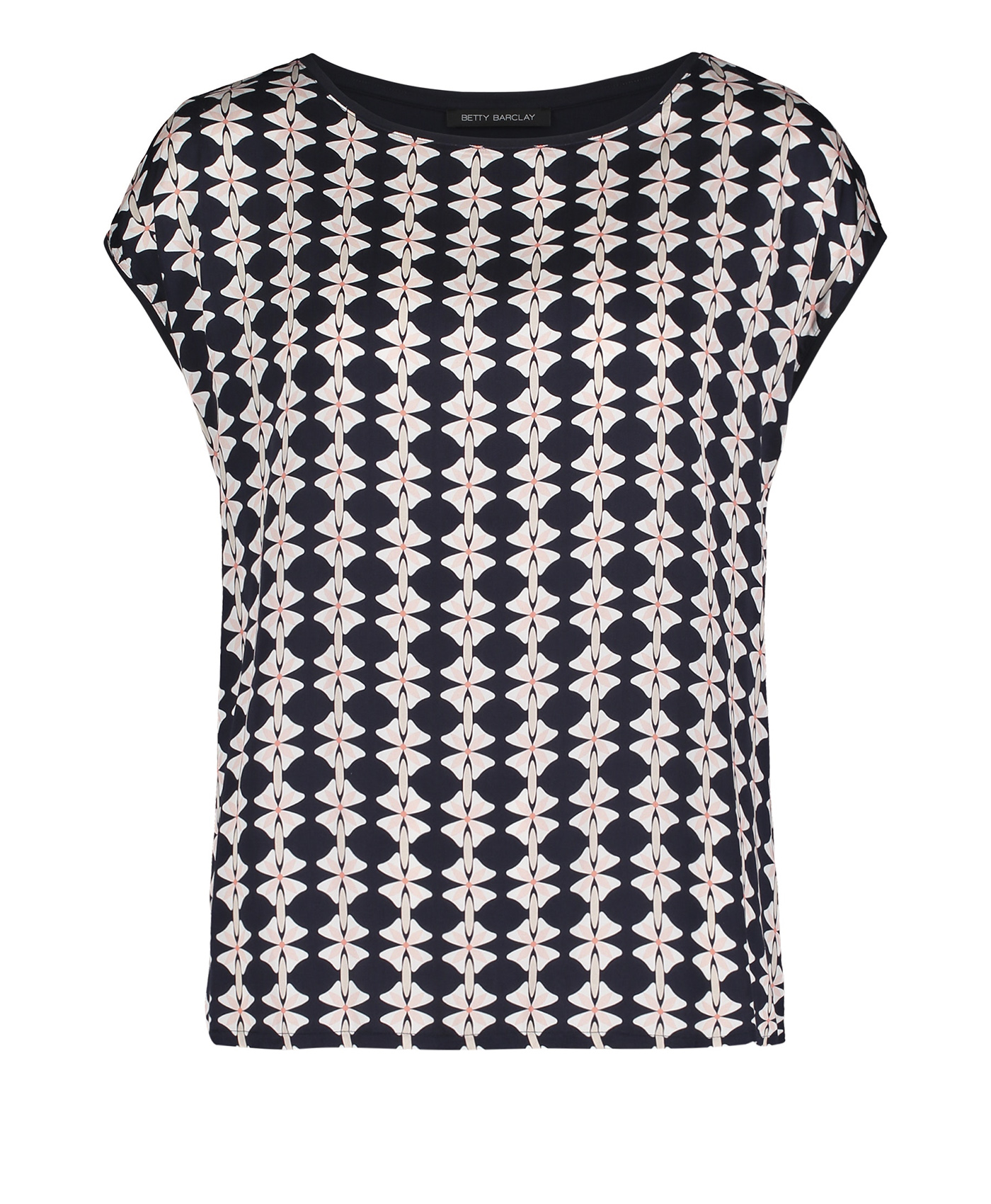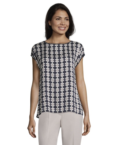 Футболка с геометрическим принтом - универсальная вещь в вашем гардеробе! Прямой покрой, короткие цельнокроеные рукава и вырез-лодочка создают непринужденный образ. Спинка изделия выполнена из однотонного материала. Вискозная смесь приятна к телу и обеспечивает комфорт. Эта футболка идеально сочетается с любым однотонным низом и обувью.