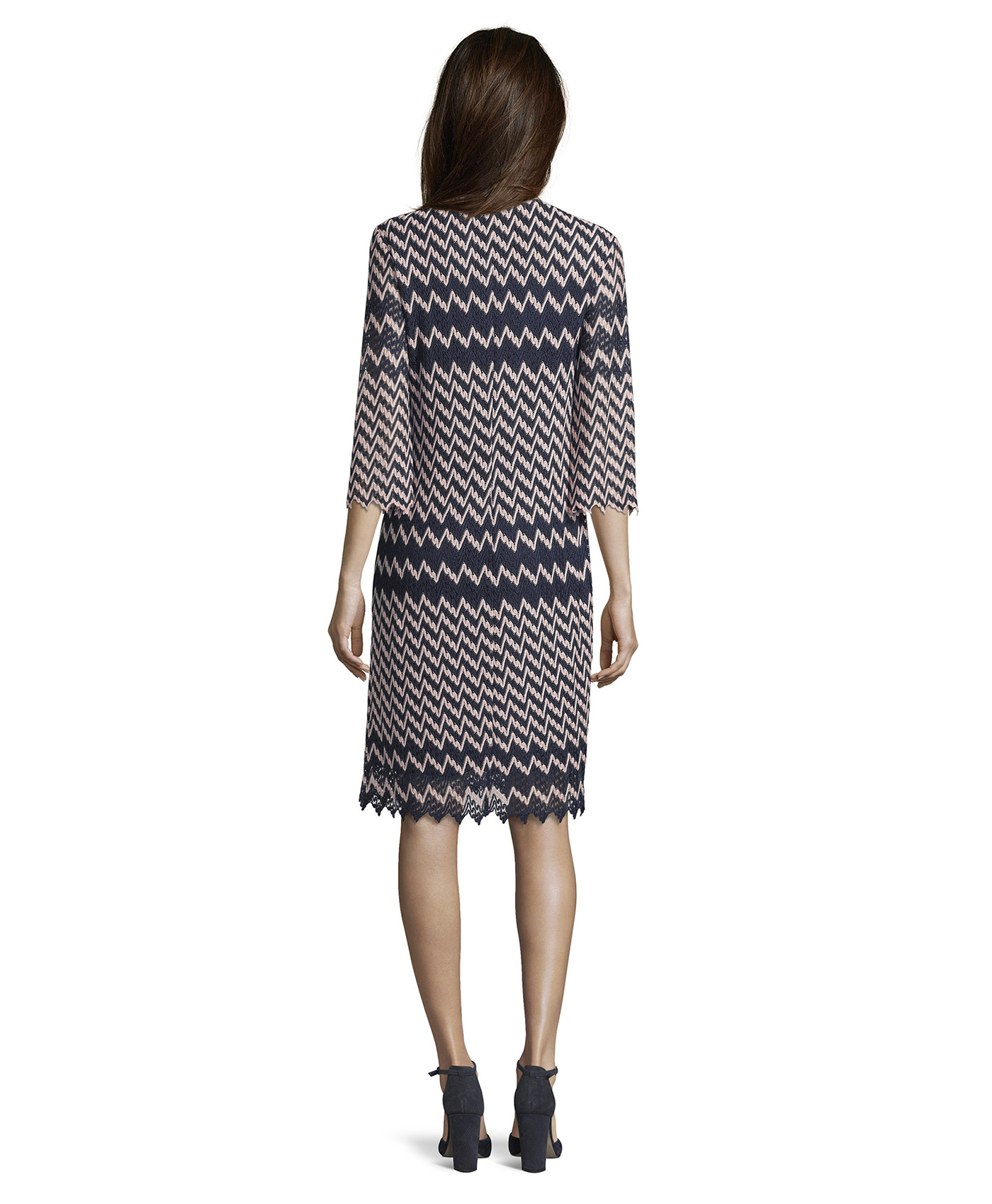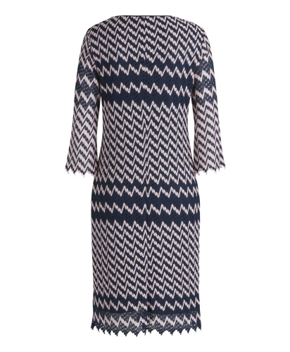 Платье с графическим узором - тренд сезона! Слегка приталенный силуэт, V-образный вырез горловины, рукава 3/4. Ажурный материал платья создает романтичный, женственный образ независимо от того, в туфлях вы или в кроссовках.
