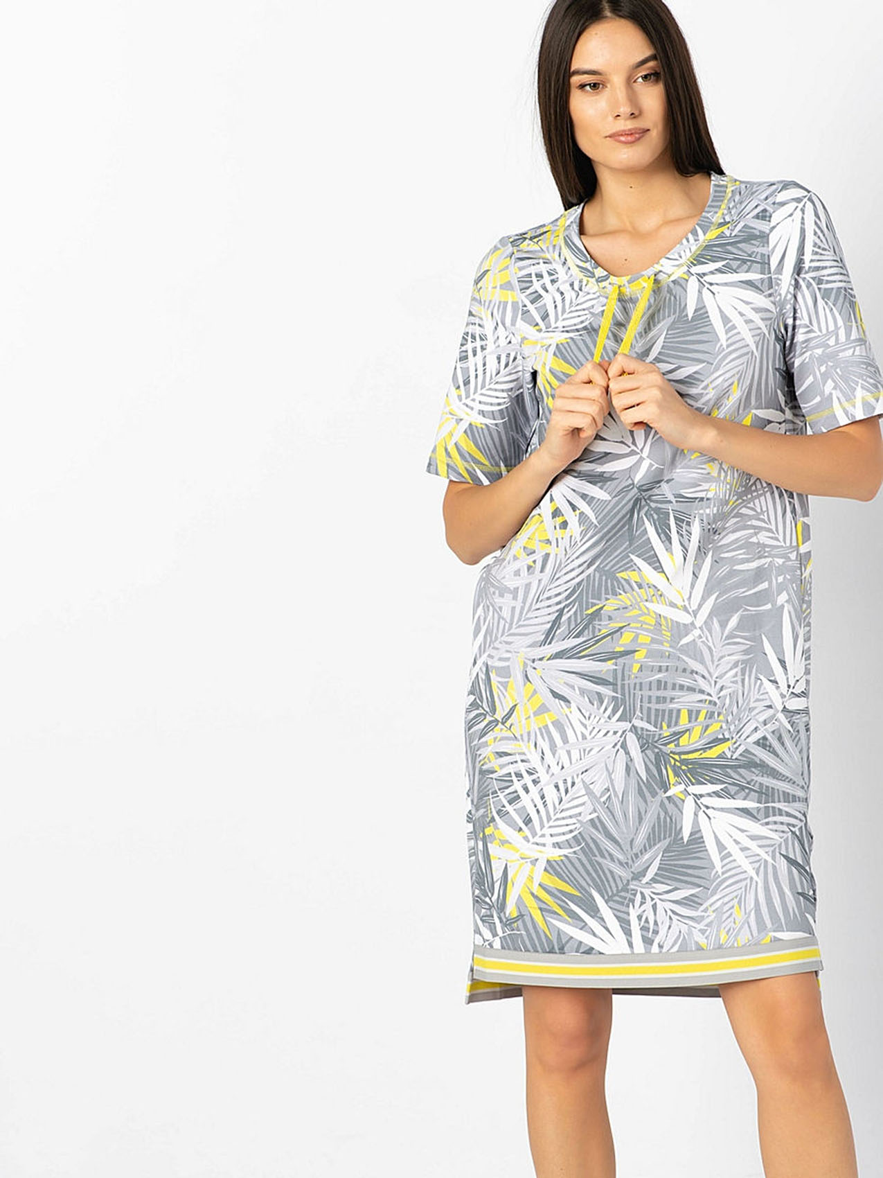 Платье миди. Круглый вырез горловины с желтыми завязками. Рукав 1/2. Удлиненная спинка, небольшие разрезы по бокам, отделка по низу изделия. Принт с тропическими мотивами, яркие цветовые акценты. Приятный к телу материал из смеси хлопка и эластана.