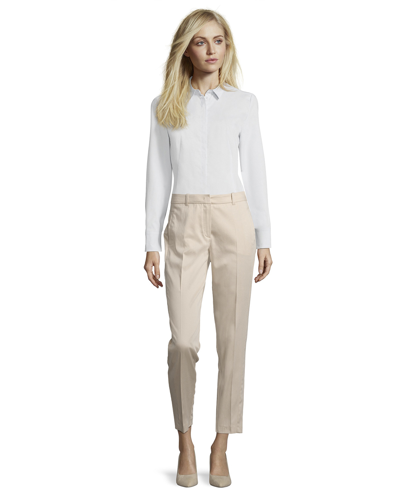 Брюки прямого кроя со стрелками. Небольшие разрезы на задней части низа брючин. Укороченная длина брюк позволяет подчеркнуть модную обувь. Приятный к телу материал из хлопковой смеси. Эти брюки гарантируют трендовый образ в сочетании с любым верхом и обувью.