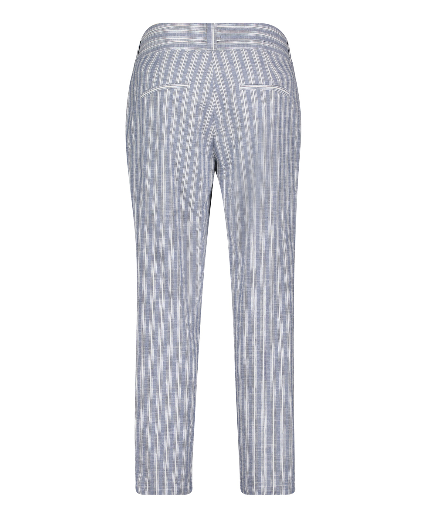 Брюки прямого кроя. Полосатый принт визуально удлиняет ноги. Длина 7/8 позволяет подчеркнуть модную обувь. Элегантная деталь модели - пояс-бант. Приятный к телу материал из смеси хлопка и льна обеспечивает комфорт в ношении. Эти брюки гарантируют трендовый образ в сочетании с любым верхом и обувью.