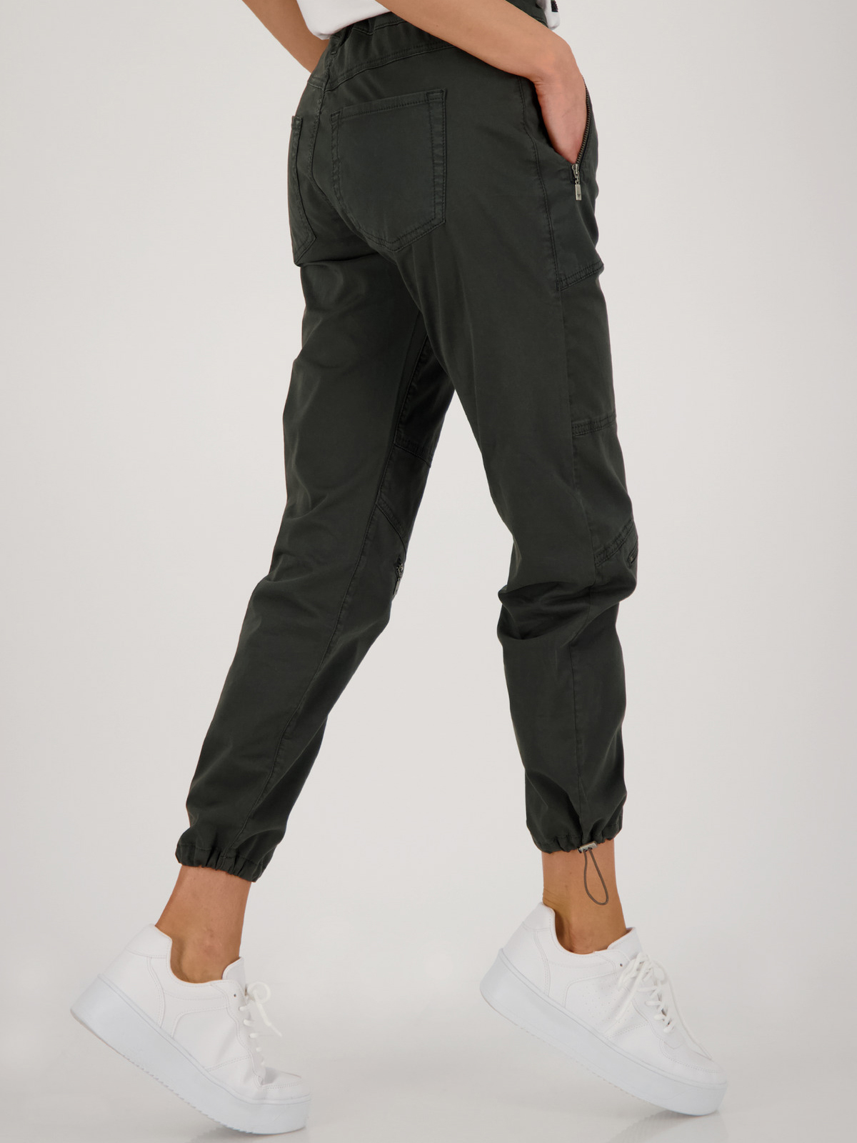 Однотонные джоггеры цвета хаки для повседневного городского образа в стиле кэжуал. Эластичный пояс с кулиской обеспечивают комфортную посадку. Объемные накладные карманы, молнии на коленях. Кулиска по низу штанин.
