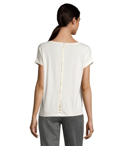 Топ с абстрактным принтом создает яркий образ. Прямой покрой, круглый вырез горловины, короткие рукава с фиксированными манжетами. Спинка изделия выполнена из однотонного материала с металлизированным принтом. Приятный к телу материал из вискозной смеси обеспечивает комфорт. Этот топ прекрасно смотрится в любом комплекте одежды.