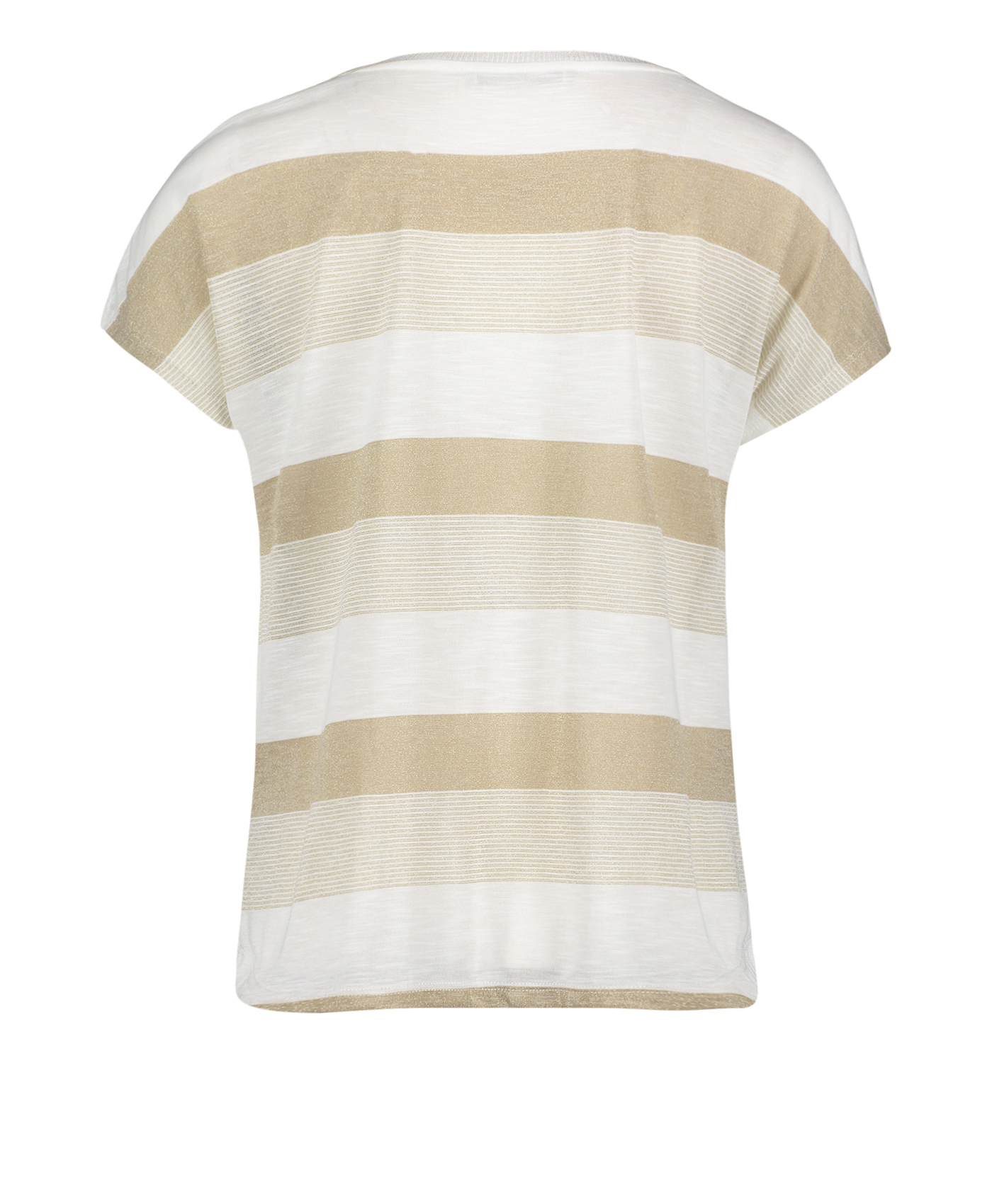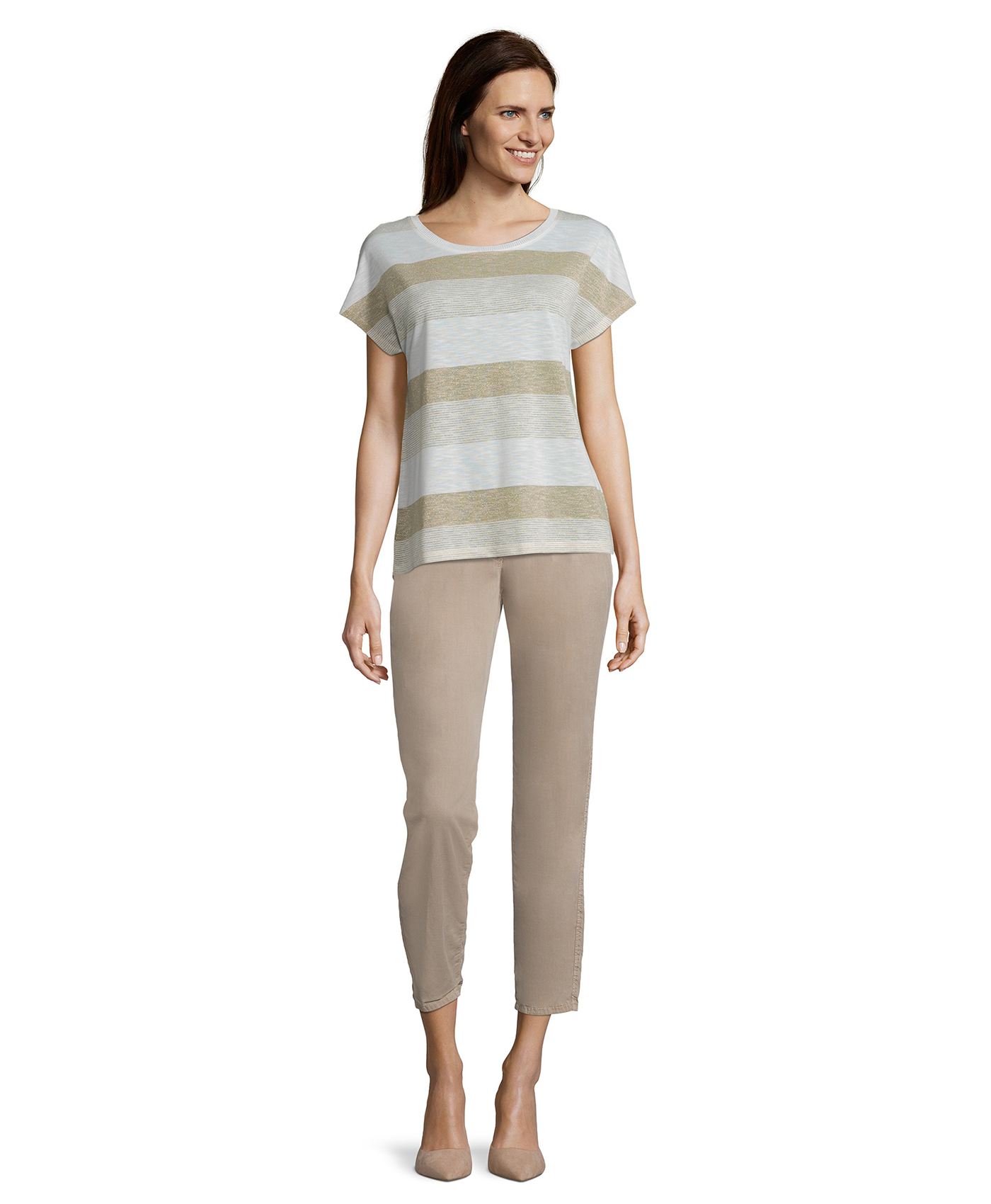 Футболка слегка приталенного силуэта. Широкий круглый вырез горловины, короткие цельнокроеные рукава. Трендовая полоска с вплетением нити люрекса. Эта простая модель - отличный компаньон в любом комплекте одежды.