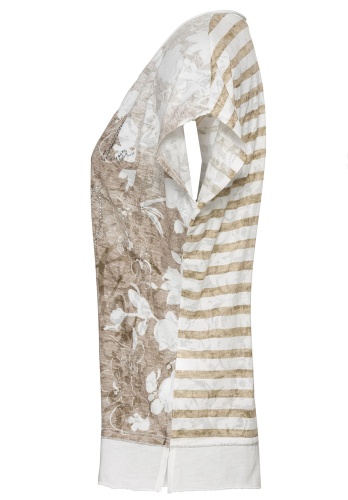 Стильная футболка Julie. Лицевая сторона украшена женственным цветочным принтом и надписью из страз. Принт в полоску на спинке изделия. Широкий низ футболки с боковыми разрезами. U-образный вырез, цельнокроеный рукав придают образу свободу и непринужденный вид. Абсолютная модная вещь для модных образов! • цветочный принт с надписью, стразы • приятный к телу материал с вискозой в составе • однотонный низ, цельнокроеный рукав • U-образный вырез, слегка приталенный силуэт • длина около 64 см