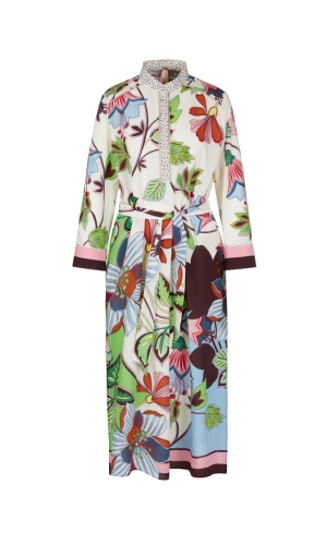 Цвветочный принт - настоящий летний хит! Платье прямого силуэта, длина ниже колена. Пояс из основной ткани ползволяет регулировать прилегание изделия и подчеркивает достоинства фигуры. Воротник-стойка, длинные втачные рукава. Приятный к телу материал из смеси шелка и хлопка обеспечивает комфорт в ношении.