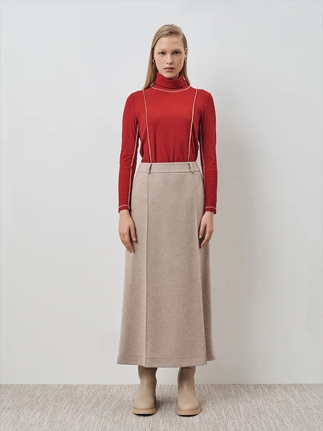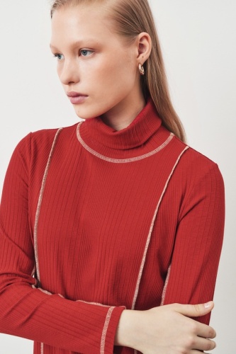 Блуза полуприлегающего силуэта из трикотажного полотна. Воротник стойка. Выполнена из кроеного трикотажа, в составе шерсть и вискоза. Швы отделаны контрастной нитью наружу