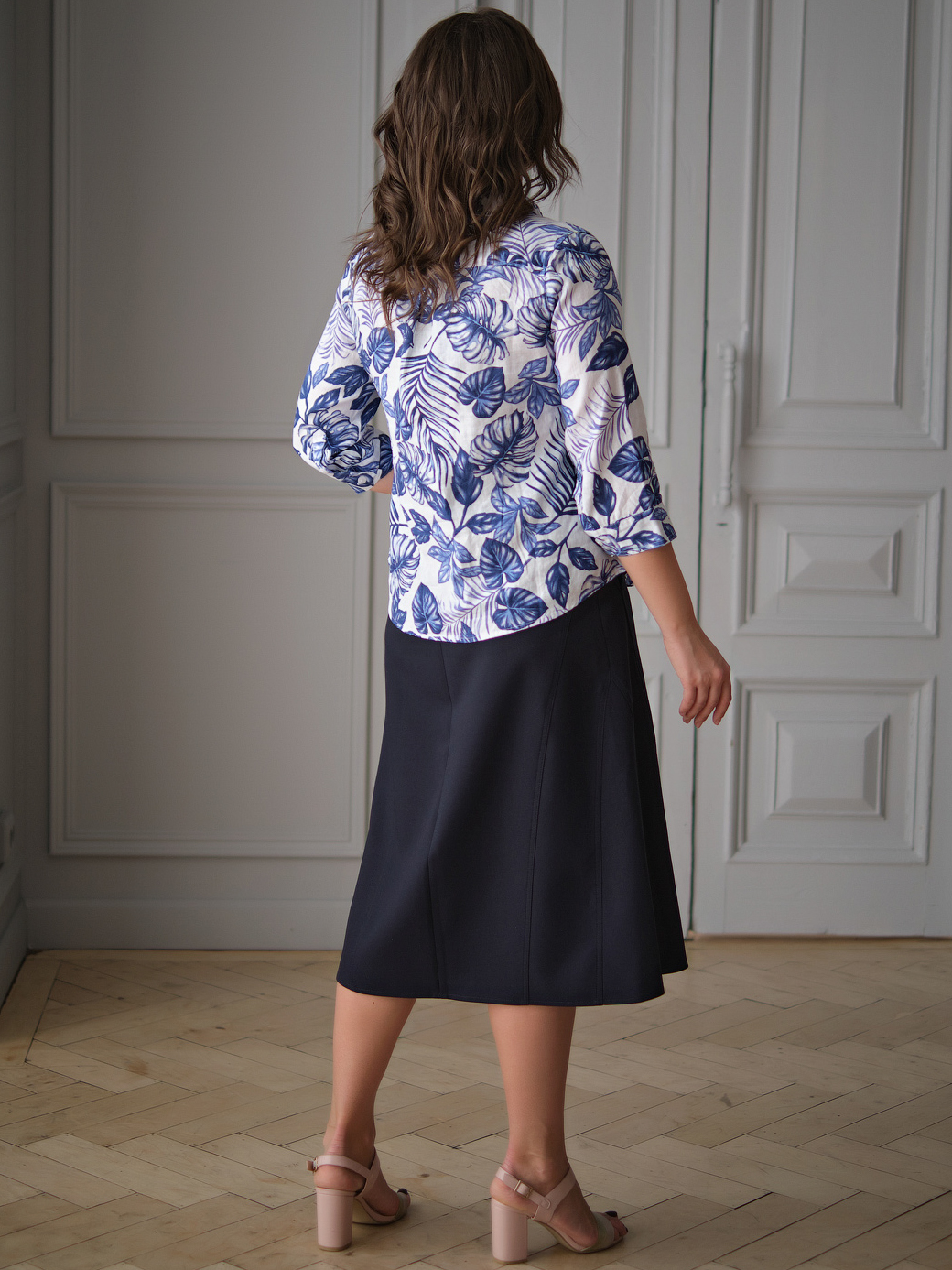 На сайте указаны Российские размеры. Льняная блузка с тропическим орнаментом - идеальный вариант для теплого сезона. Материал дышит, приятен к телу и обеспечивает правильную терморегуляцию. Прямой крой скрывает недостатки фигуры и подчеркивает ее достоинства. Втачной рукав ¾ с манжетой. Отложной рубашечный воротник. Застежка на пуговицы. Ткань: блузка из качественного 100% льна средней плотности – идеального материала, который одинаково комфортен как летом, так и в межсезонье. Крой: модель имеет свободный силуэт, среднюю длину, подходящую под разные типы фигур, и актуальный втачной рукав ¾ с манжетом. Лаконичный рубашечный воротник красиво подчеркивает зону шеи. Отделка: стильный бело-синий принт с тропическими монстерами, не выходящими из моды на протяжении многих сезонов, освежает образ и придает ему курортного очарования. Застежка-планка и манжеты украшены пуговицами, которые легко вдевать. Встречная планка под кокеткой обеспечивает максимальный комфорт при движении. Универсальная модель прекрасно со