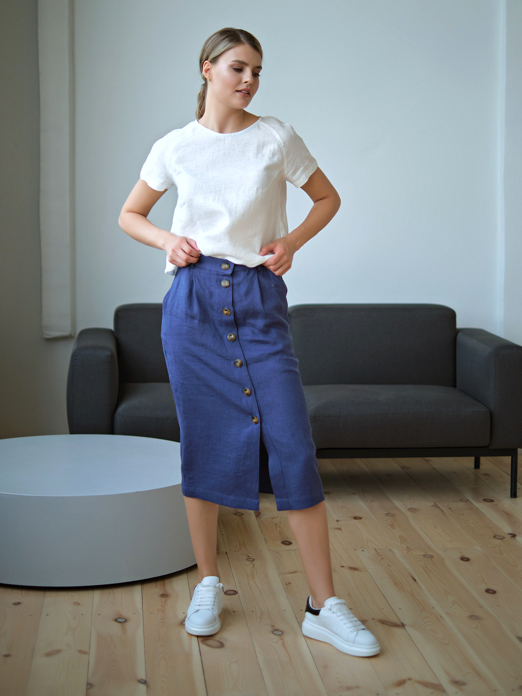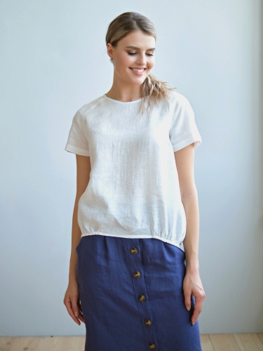 На сайте указаны российские размеры. Блузка из 100-го льна идеально подойдет для жаркой летней погоды. Лен приятен к телу, позволяет коже дышать и обеспечивает правильную терморегуляцию. Свободный силуэт подчеркивает достоинства и скрывает недостатки фигуры. Короткий рукав-реглан позволяет оголить руки и сделать образ легким. Овальный вырез горловины подчеркивает изящество линии шеи. По низу изделия эластичная резинка. Данную модель можно носить, заправляя в юбку, шорты или брюки, либо навыпуск. Ткань: Легкая блузка выполнена из 100% льна – максимально комфортного для носки материала. Имеет благородную полупрозрачную фактуру, при этом не просвечивает, благодаря чему может быть использована даже в деловом стиле. Крой: Свободный силуэт позволяет добиться непревзойденного комфорта при движении. Базовая модель с круглым вырезом и удобным коротким рукавом, как у футболки, легко вписывается в любой гардероб и подходит под разные стили. Отделка: аккуратная резинка по низу изделия.