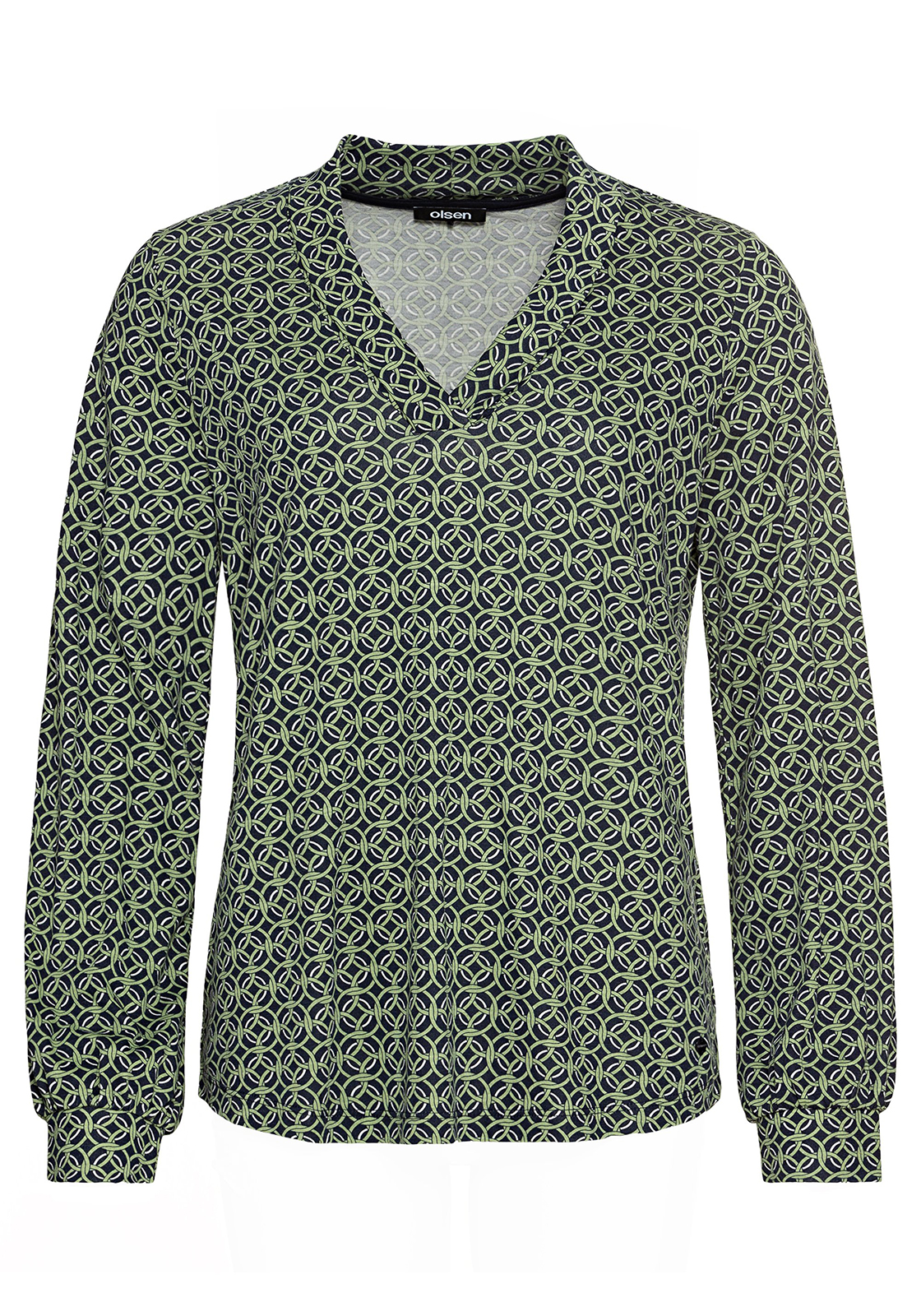 Блуза с геометрическим узором по всей поверхности изделия. Женственный V-образный вырез горловины, прямой крой. Длинные втачные рукава с манжетами. Блузу можно носить как навыпуск, так и заправленной в брюки или юбку-миди.