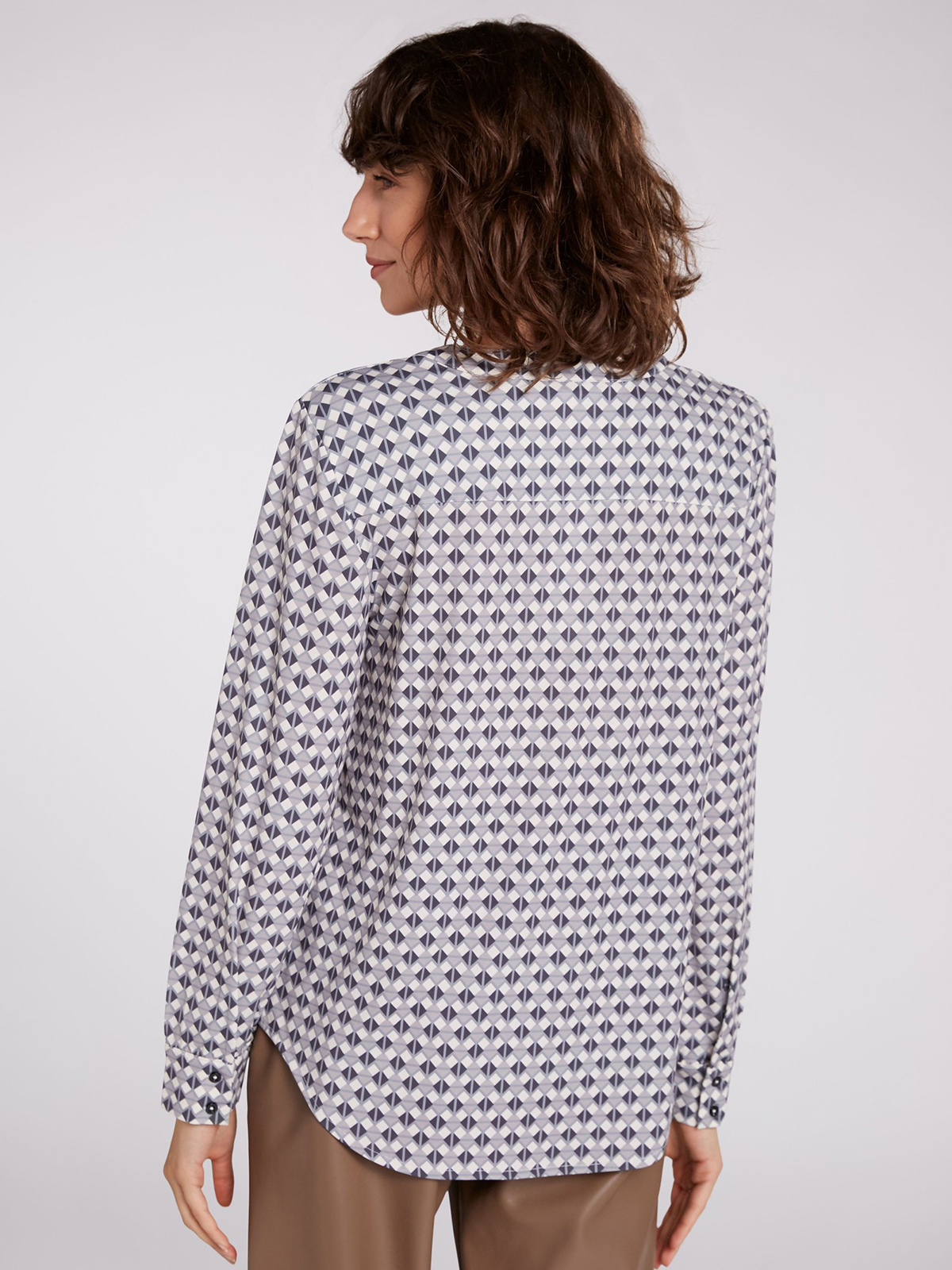 Блуза с оригинальным геометрическим узором по всей поверхности изделия. V-образный вырез горловины, длинные втачные рукава с манжетами на пуговицах.