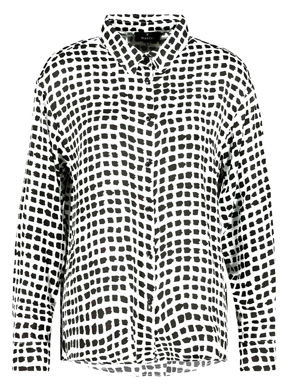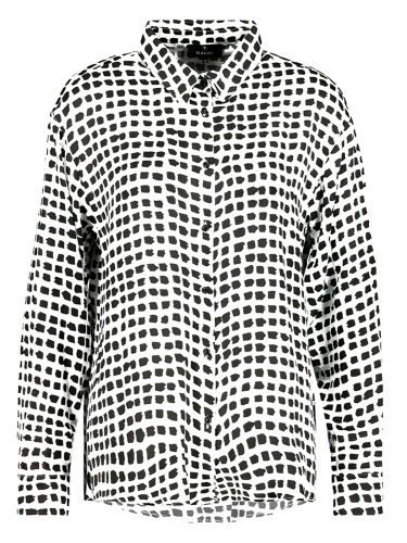 Блуза в монохромном дизайне с абстрактным узором по всей поверхности изделия. Прямой крой, материал из 100% вискозы. Отложной рубашечный воротник, планка с пуговицами в тон. Длинные втачные рукава с манжетами.