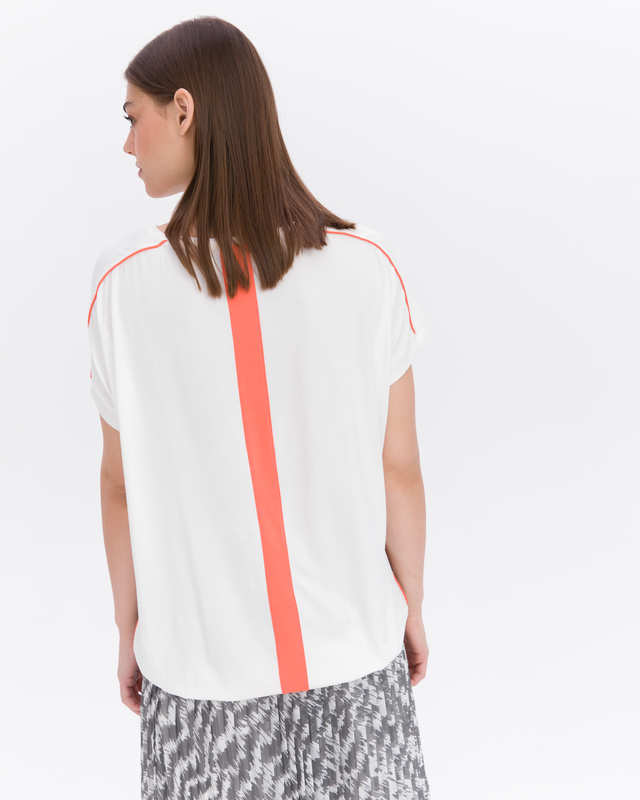 Блузка с анималистическим принтом на полочке и яркой полоской на спинке. Выполнена из эластичного материала на основе вискозы. Прямой крой. Короткий цельнокроеный рукав .