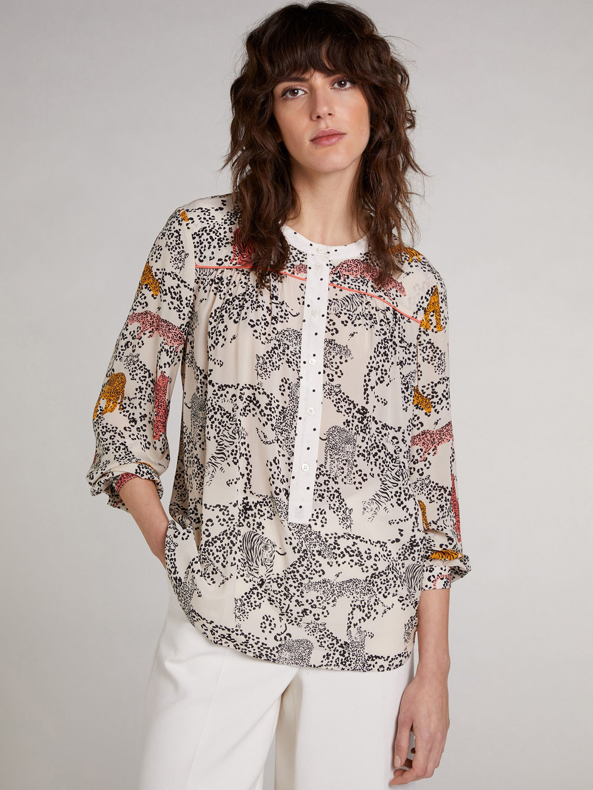 Блуза с анималистичным узором по всей поверхности материала. Планка с пуговицами и воротник с точечным рисунком. Втачной рукав полной длины с манжетой на одну пуговицу. Скругленный низ изделия.