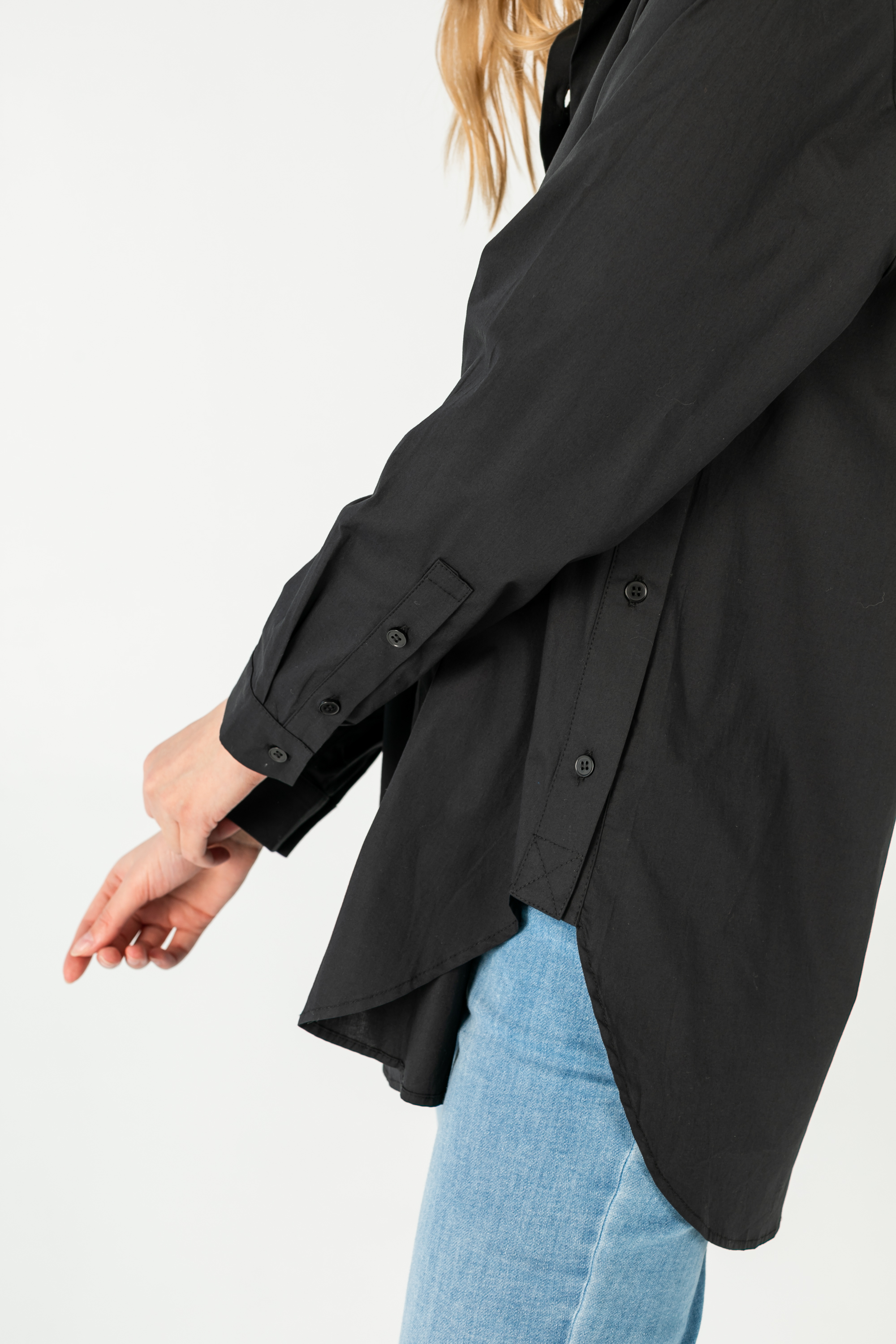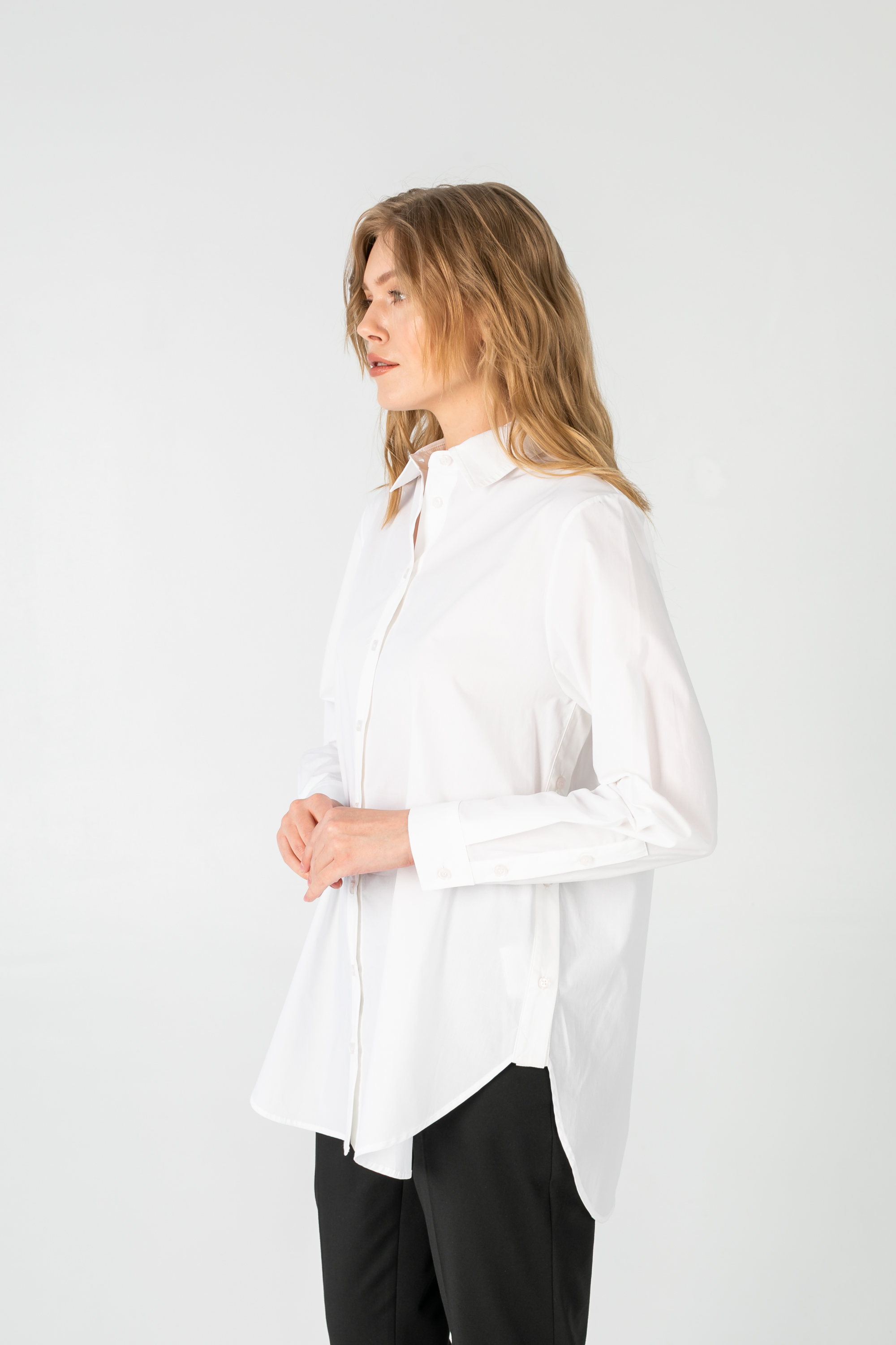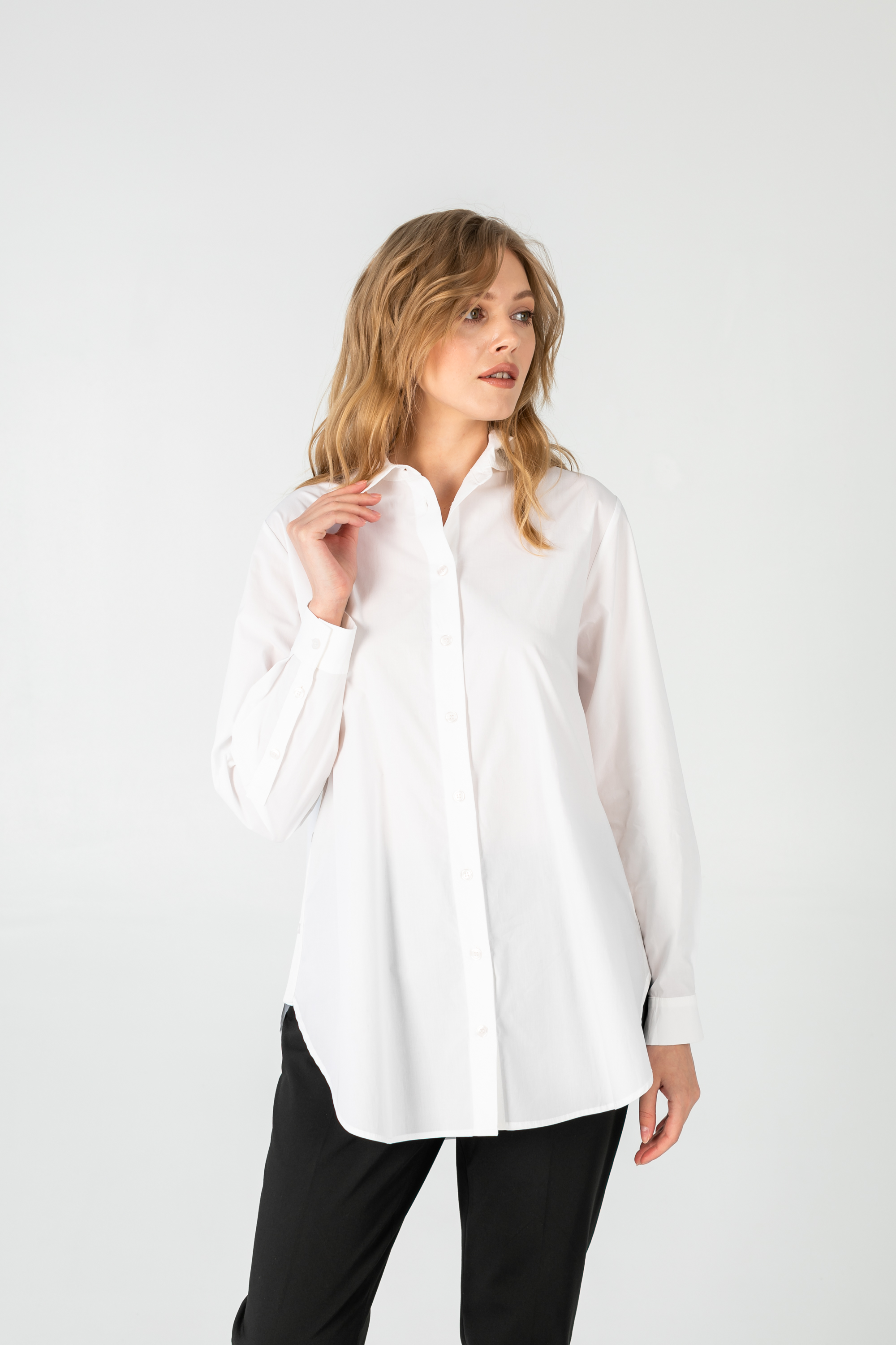 Классическая рубашка в 2-х цветах в стиле оверсайз с удлинением и декоративным элементом на спине.