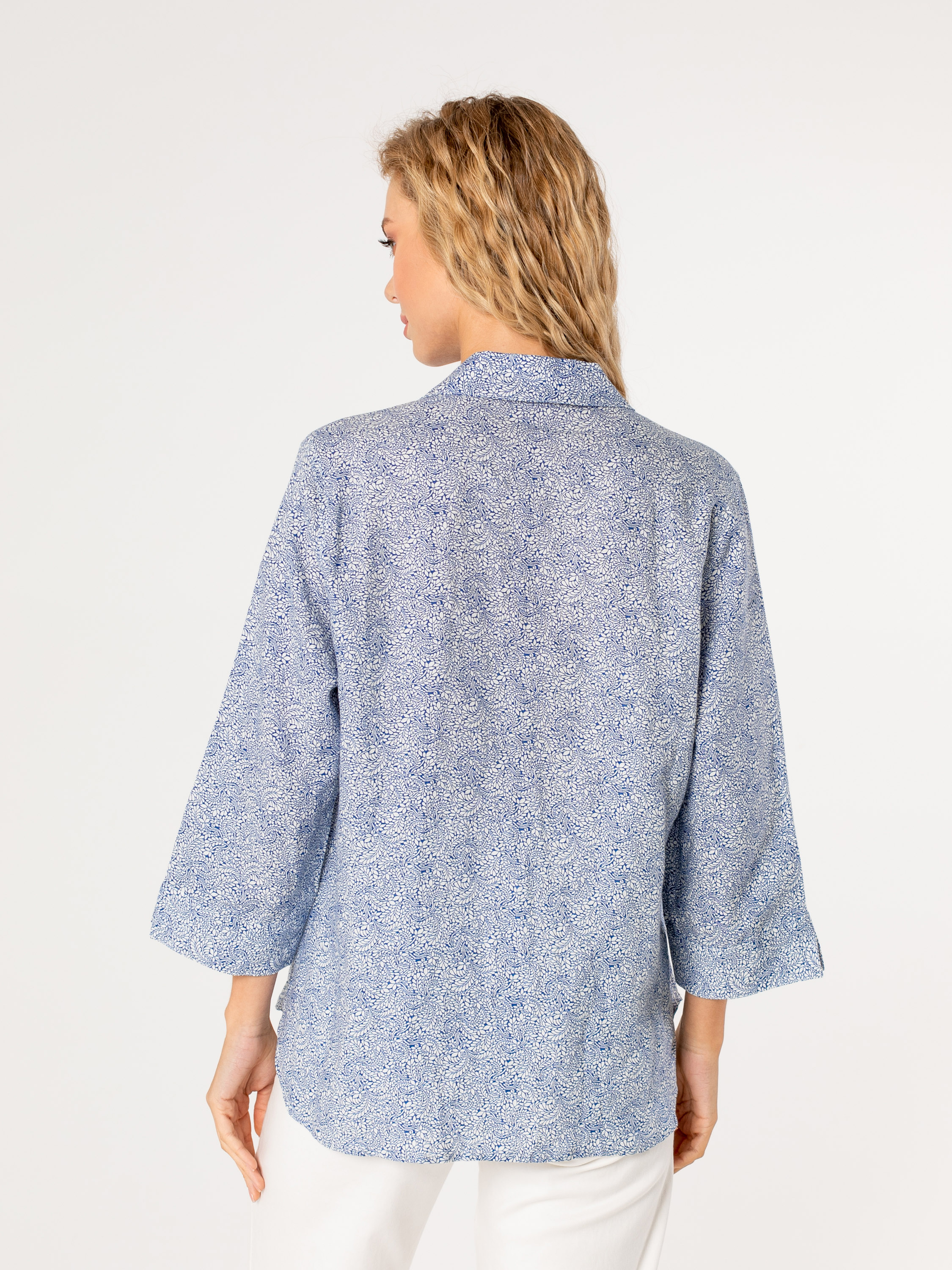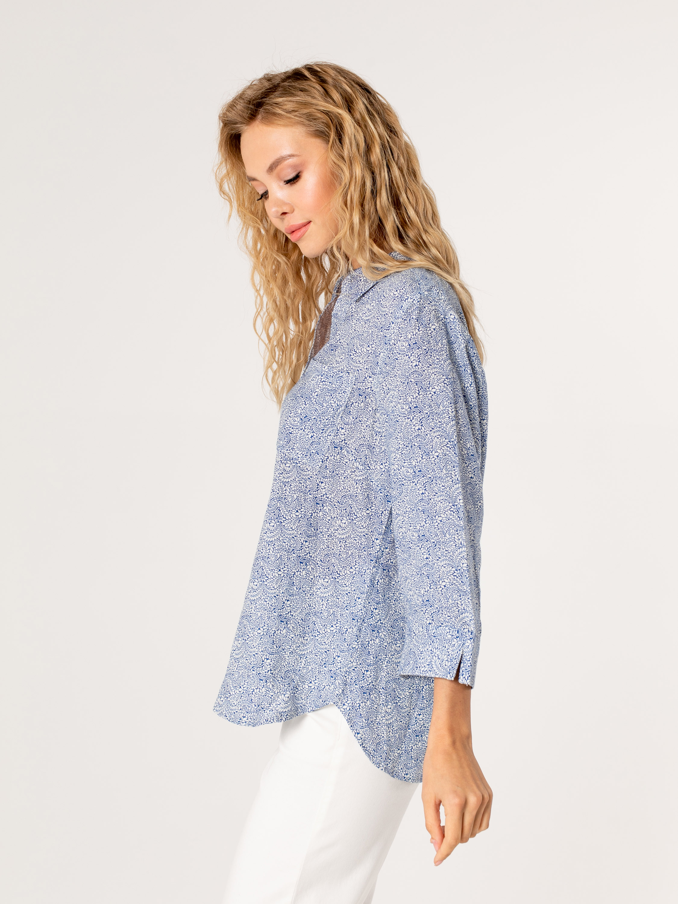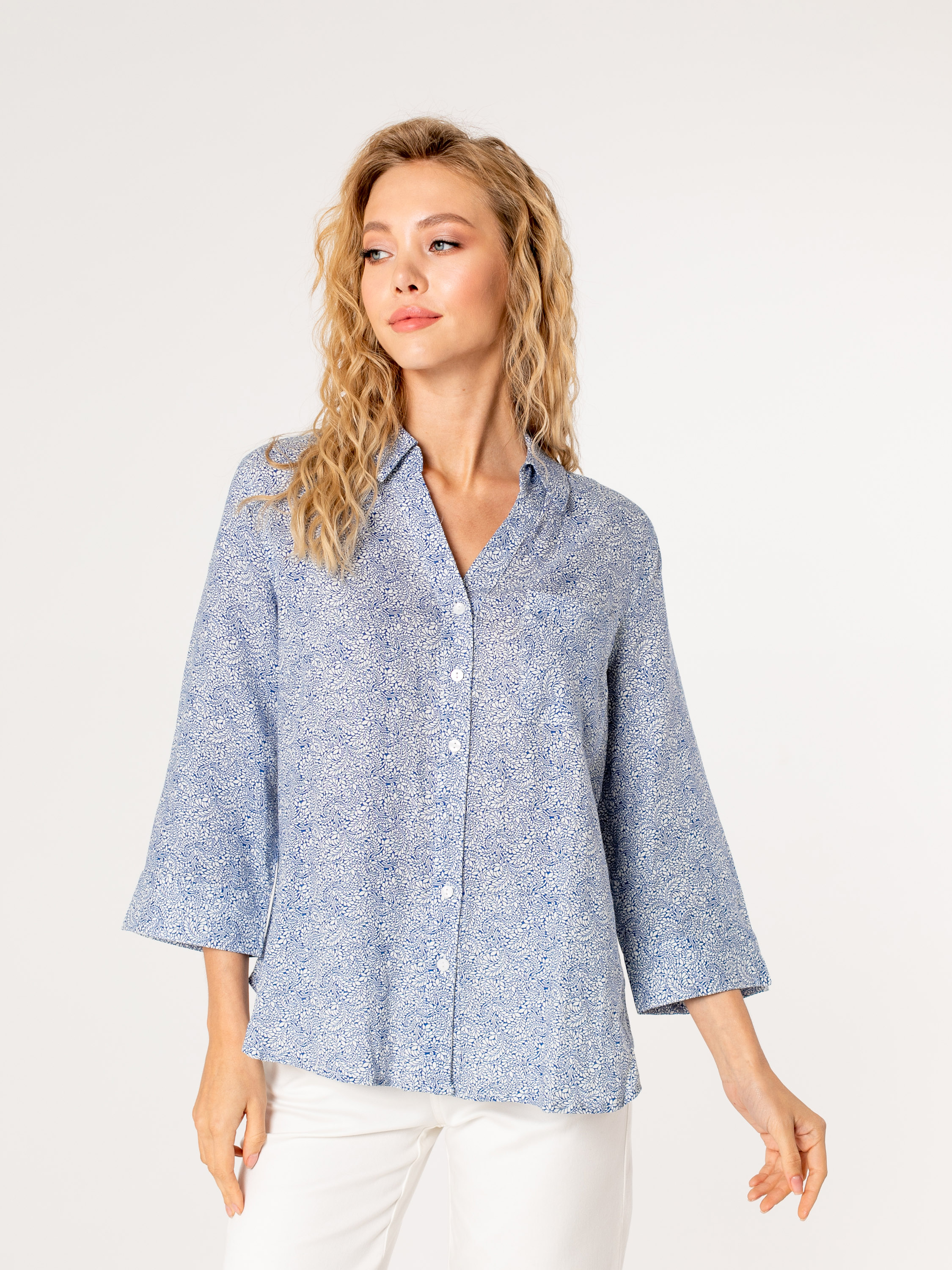 На сайте указаны российские размеры. Ткань: стильная блузка из смеси хлопка и льна – выбор тех, кто привык выбирать максимальный комфорт. Крой: свободный силуэт с отрезными расклешенными рукавами дарит свободу движения.. V-образный вырез и небольшой рубашечный воротничок подчеркивают красоту шеи, не фокусируя внимание на зоне декольте. Удлиненная блузка с идеальной посадкой позволяют показать достоинства и мастерски скрыть возможные недостатки фигуры. Отделка: стильный бело-синий принт приковывает взгляды. Широкие манжеты с разрезами можно подвернуть, добившись нужной длины рукава. Фигурный низ блузки с плавными линиями создает женственный силуэт. Сочетайте блузку с однотонным ассортиментом из коллекции Stern – брюками, юбками, трикотажем и денимом.