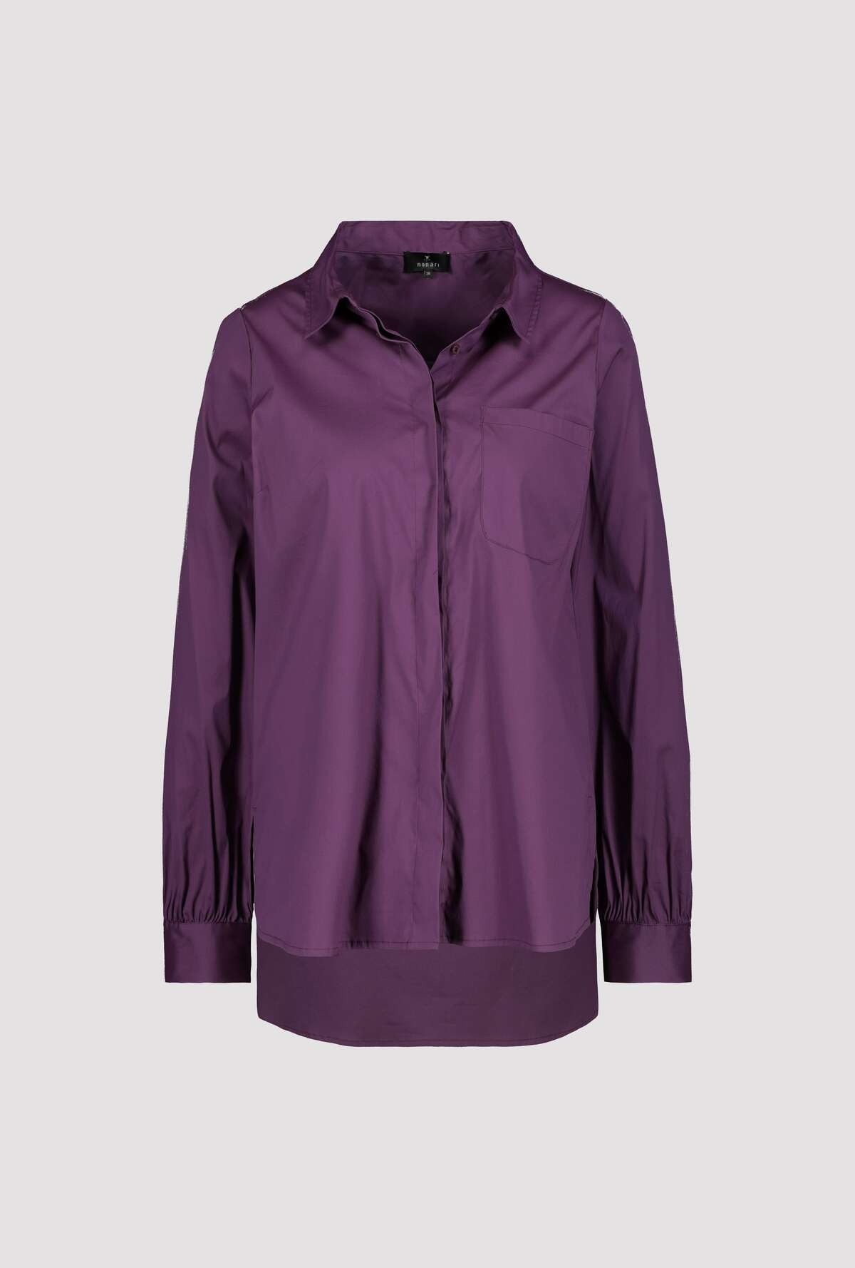 На сайте указаны российские размеры. Однотонная блуза-рубашка от monari. Стильная модель, которая вам понравится благодаря длинным рукавам с манжетами на пуговицах, длинному прямому крою с боковыми разрезами и удлиненному закругленному низу. Передняя часть имеет передний плечевой шов, накладной карман на уровне груди и планку на потайных пуговицах, а задняя часть украшена кокеткой с модной складкой. Рост модели 178 см Длина по спинке 44 размера составляет 79 см, а по переду – 74 см.