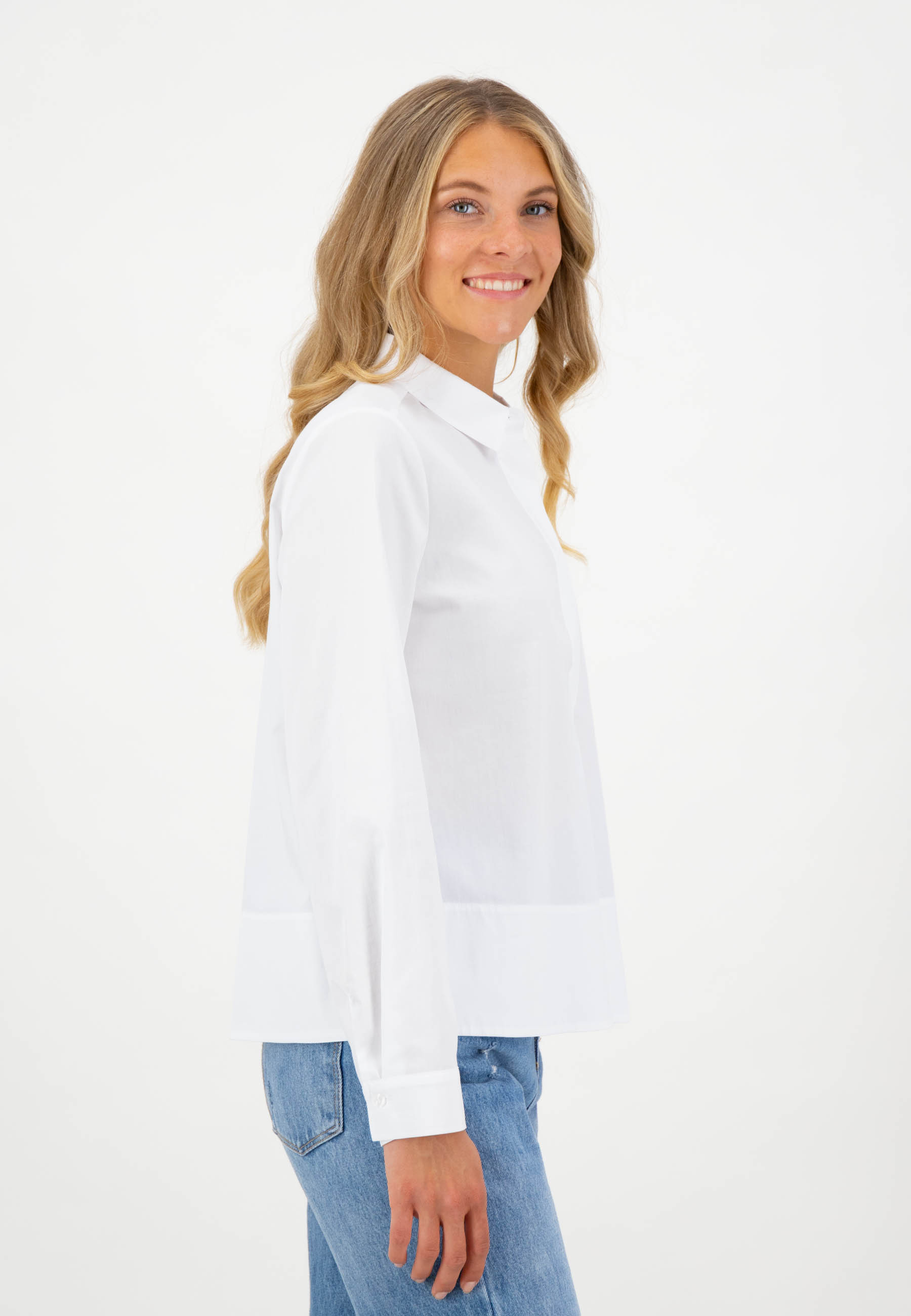 На сайте указаны российские размеры. Белая блузка с длинными рукавами и планкой на потайных пуговицах. Эта блузка имеет спортивный вид, современный и современный благодаря планке с потайными пуговицами, воротнику рубашки и разделительному шву, но и ее качество: экологически чистые материалы, произведенные в Европе. Повседневную блузу можно комбинировать несложно и универсально, поэтому она идеальна для повседневного образа. Рост модели 177 см Измерения для 46 размера: Окружность груди: 104 см Бедра: 125 см Длина спинки: 60 см. Длина рукава: 61 см.
