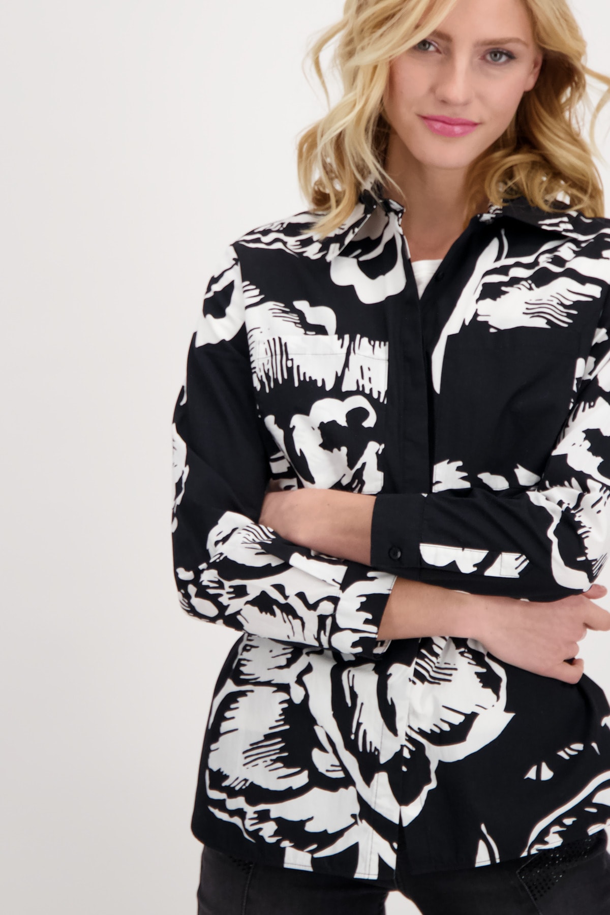 На сайте указаны российские размеры. С модной блузкой-рубашкой от monari у вас будет отличный наряд на любой случай. В классическом крое с отложным воротником, длинными рукавами с манжетами на пуговицах, планкой на потайных пуговицах и двумя накладными карманами на груди вас вдохновит модель с закругленным низом. Стильные цветочные узоры снова в моде в этом сезоне и придают каждому образу что-то свое. Совет по стилю: наденьте расстегнутую поверх современной футболки с лакированными надписями и темных джинсов. Модель ростом 179 см. Длина спины 44 размера 73 см.