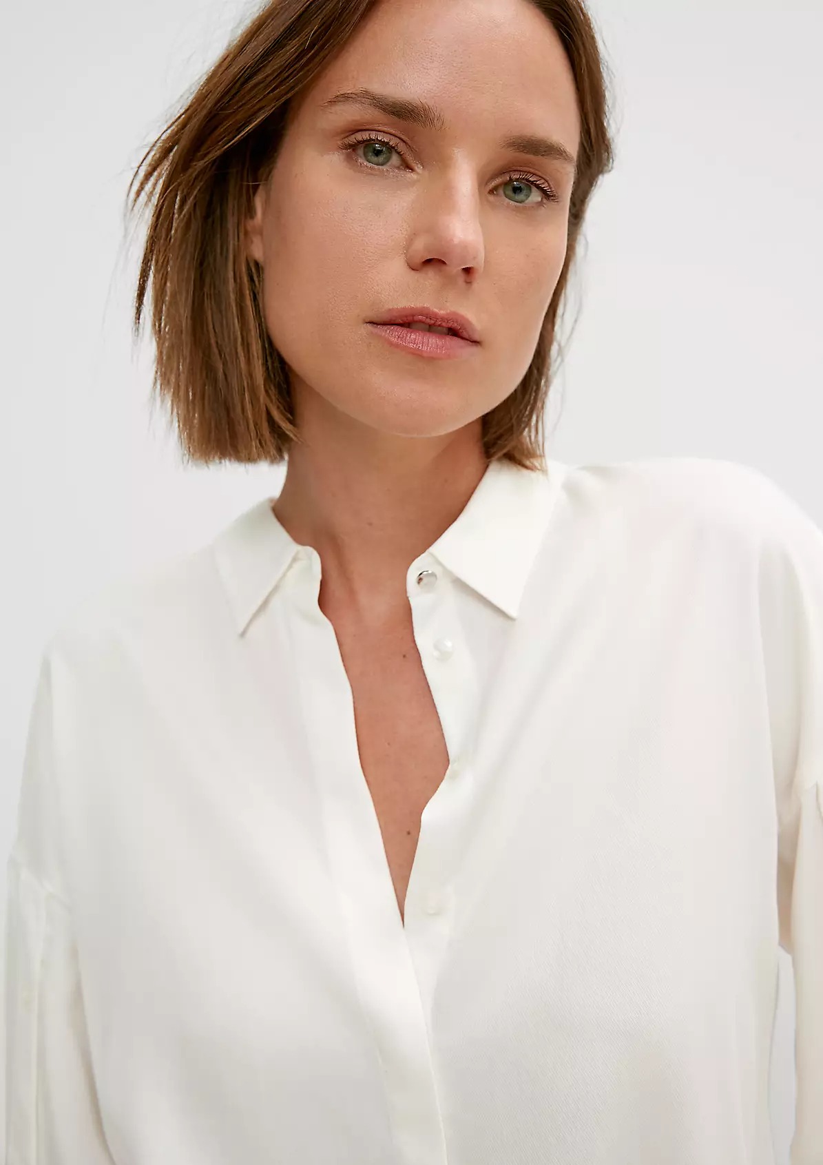 На сайте указаны российские размеры. Легкая классическая блуза с закругленным низом и разрезами сбоку. Застежка: планка с потайными пуговицами. Рукав: манжеты.