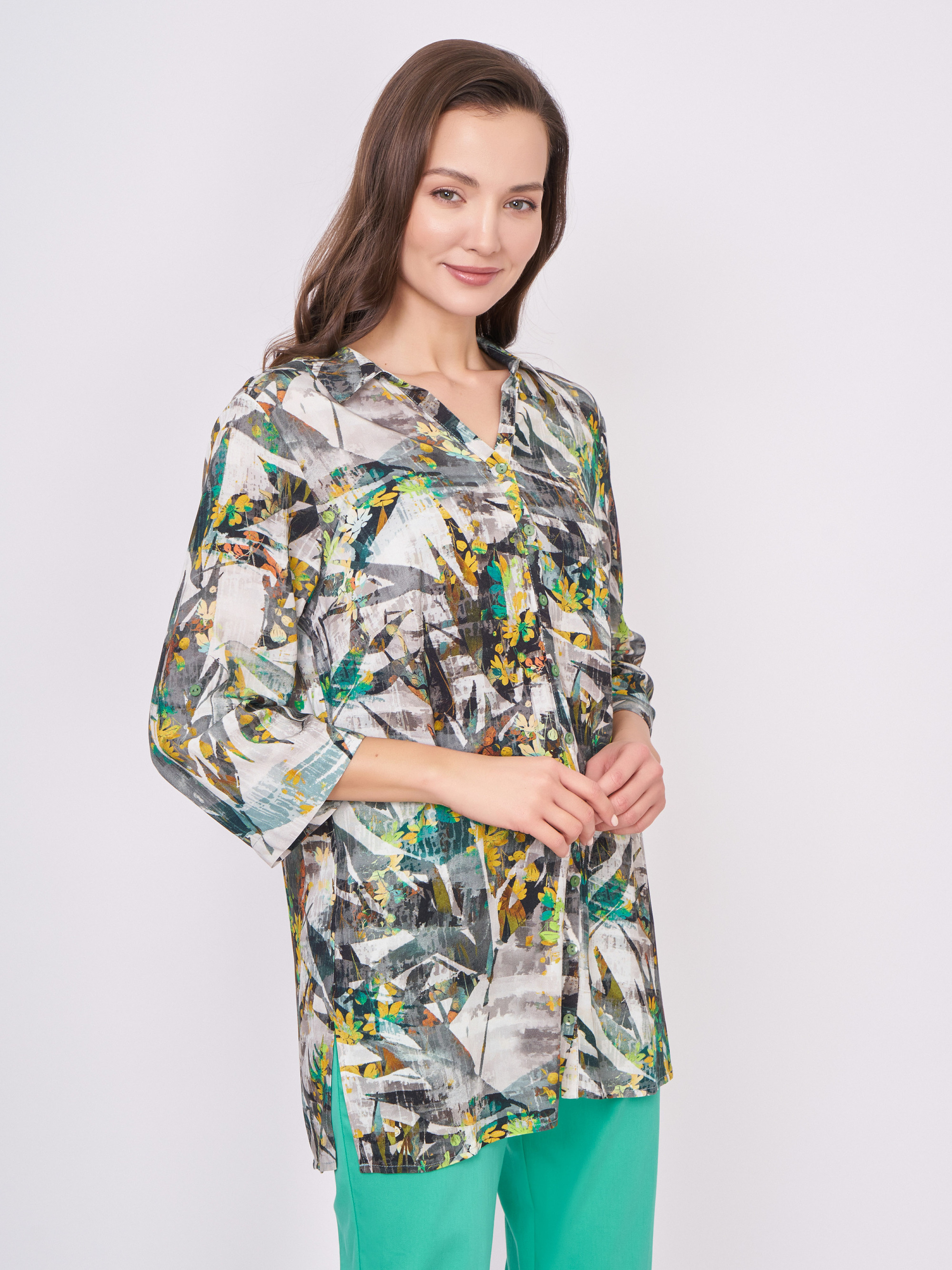 На сайте указаны российские размеры. Текстильная прямая зелено-серая блузка на пуговицах, с отложным воротником, с укороченным рукавом 3/4, с цветочным рисунком. Длина по спинке: 77 см. Рост модели: 177 см.