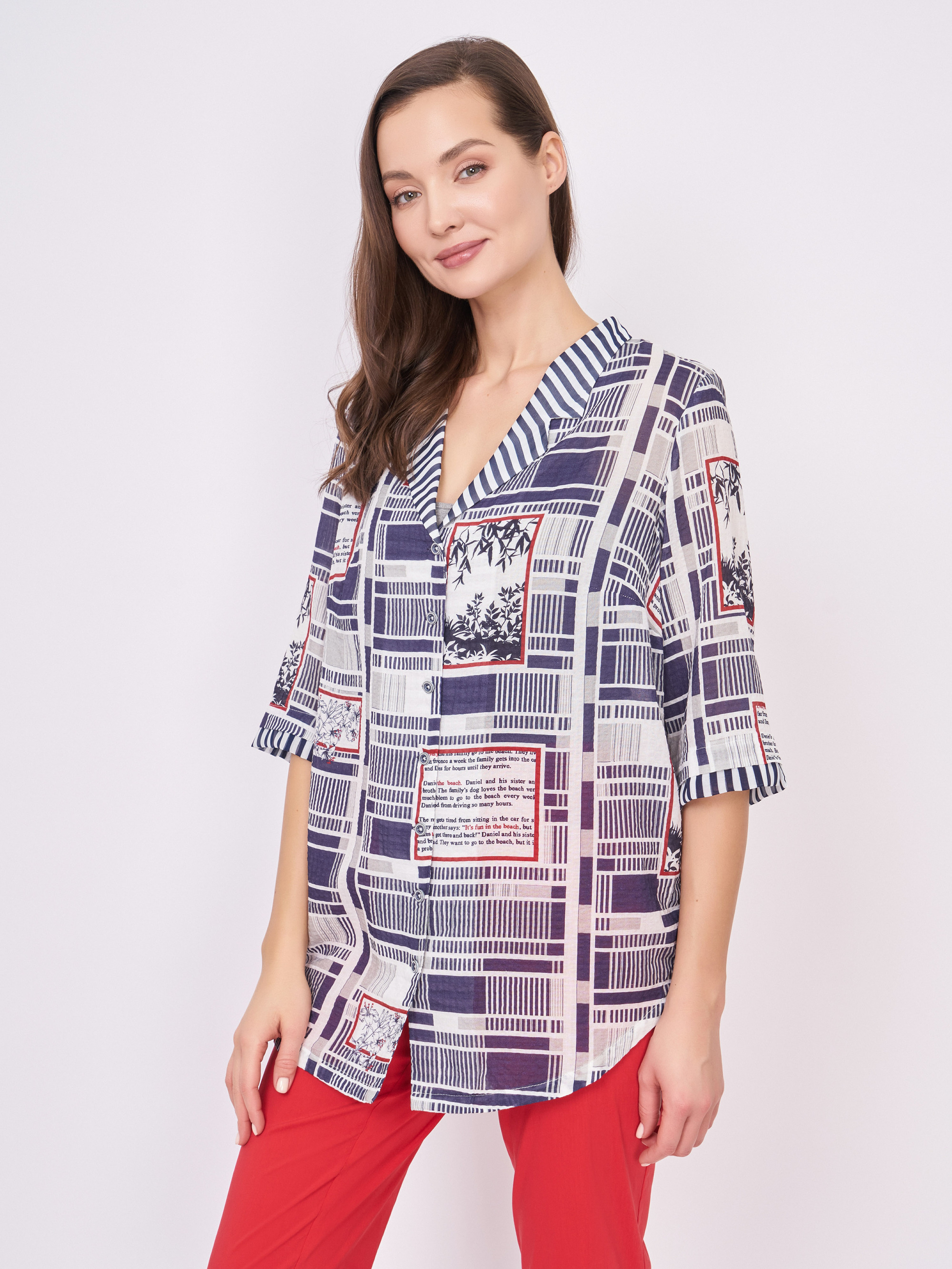 На сайте указаны российские размеры. Бело-синяя блузка трапеция на пуговицах, с отложным воротником, с красными вставками, с геометрическим, с цветочным рисунком и надписями. Длина по спинке: 72 см. Рост модели: 177 см.