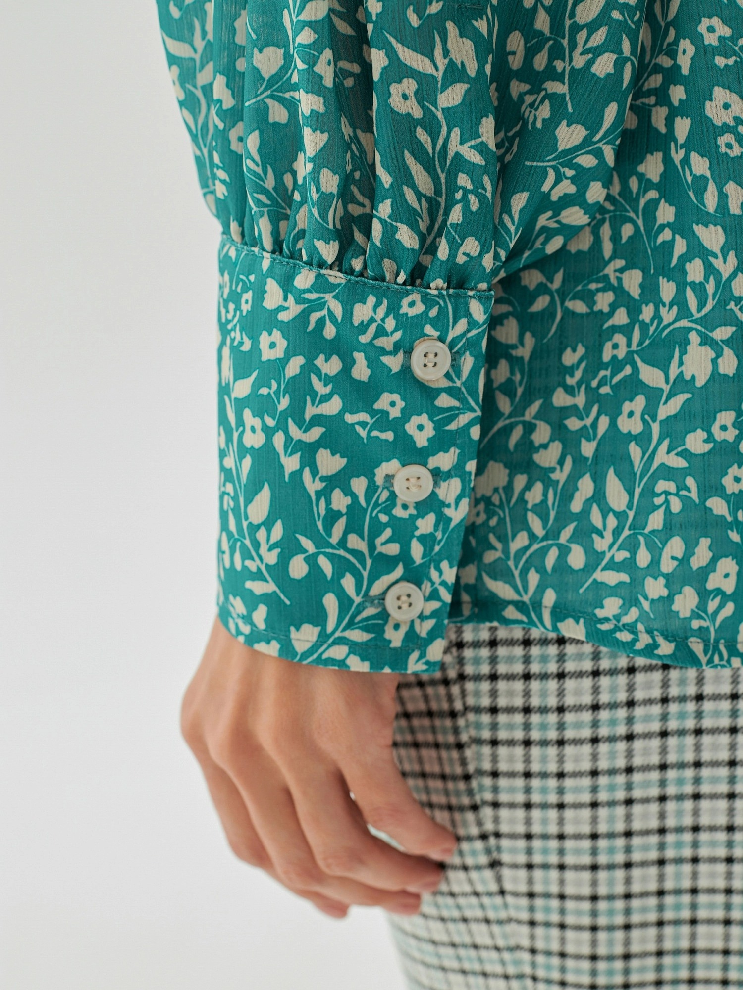 На сайте указаны российские размеры. Романтичная прямая блуза с отложным воротником бирюзового цвета с цветочным принтом из плательной ткани. Рост модели 175 см.