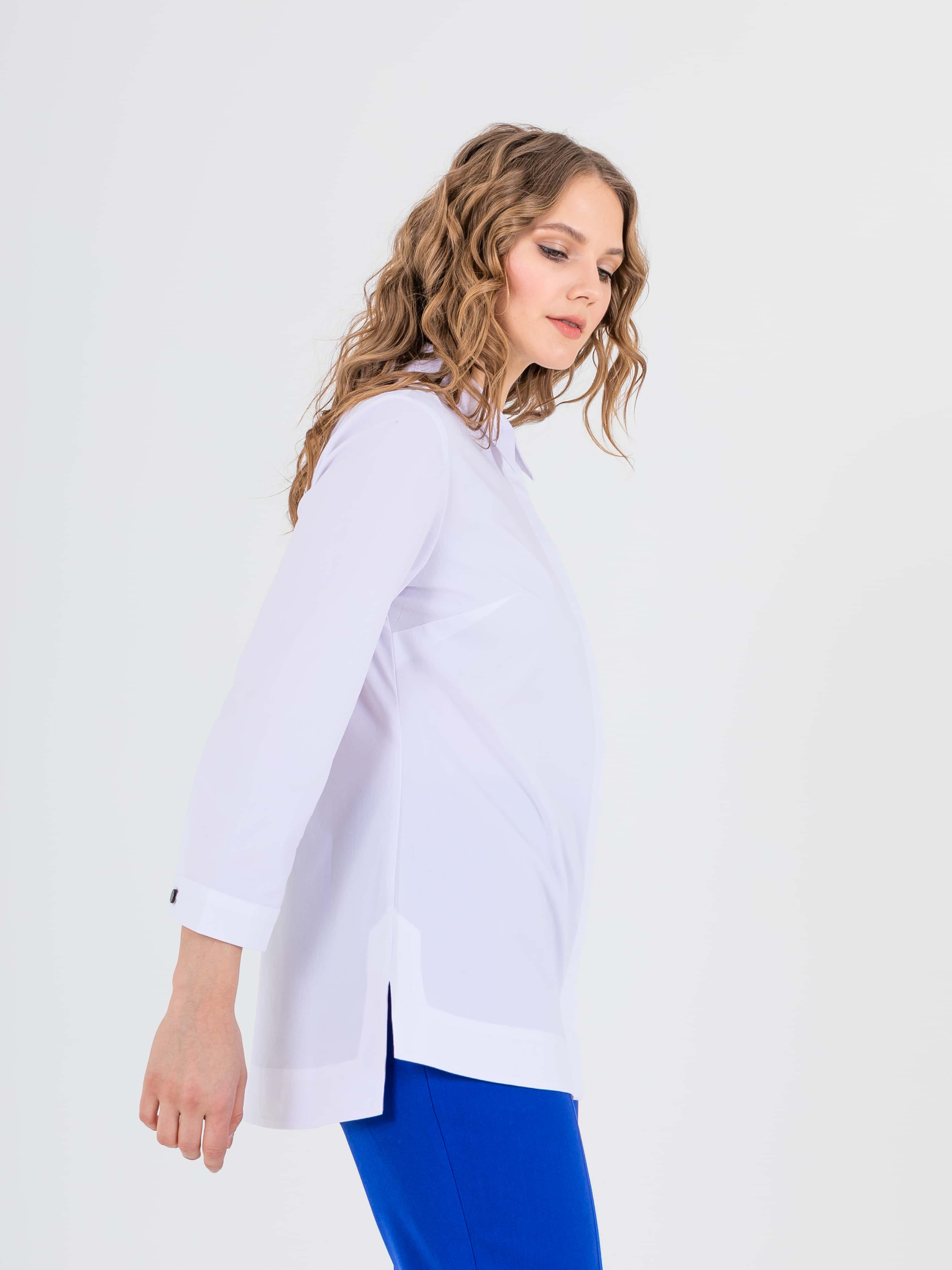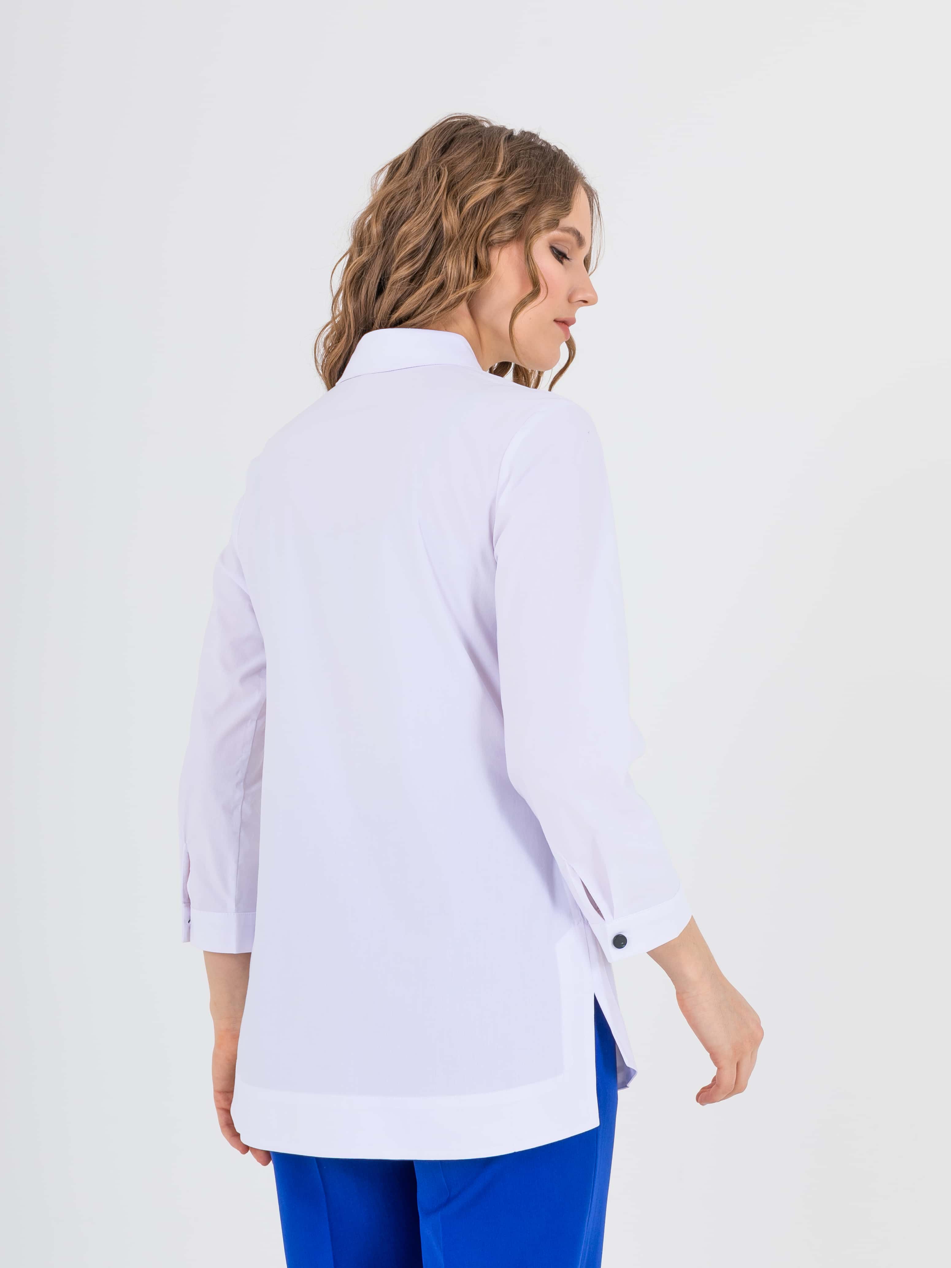 На сайте указаны российские размеры. Блуза полуприлегающего силуэта длиной до линии бедер с ассиметричной линией низа и разрезами в боковых швах. Перед с двумя вытачками на выпуклость груди, идущими из боковых швов, также на левой половине переда в области груди выполнен яркий, интересный принт. Застежка потайная на 10 пуговиц. Втачные рукава ¾ с манжетами, прорезными петлями и пуговицами. Стояче-отложной воротник.
