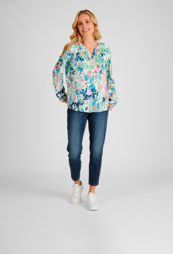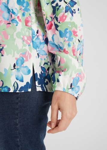 На сайте указаны российские размеры. Блузка впечатляет своим цветочным принтом по всей поверхности. Небольшой боковой разрез почти гарантирует идеальную посадку. Неброский воротник-стойка и V-образный вырез придают блузе дополнительную женственность. Сочетайте блузку с джинсами или небрежно с спортивными брюками. Рост модели 176 см. Длина по спинке от плеча для размера 46: 66 см.