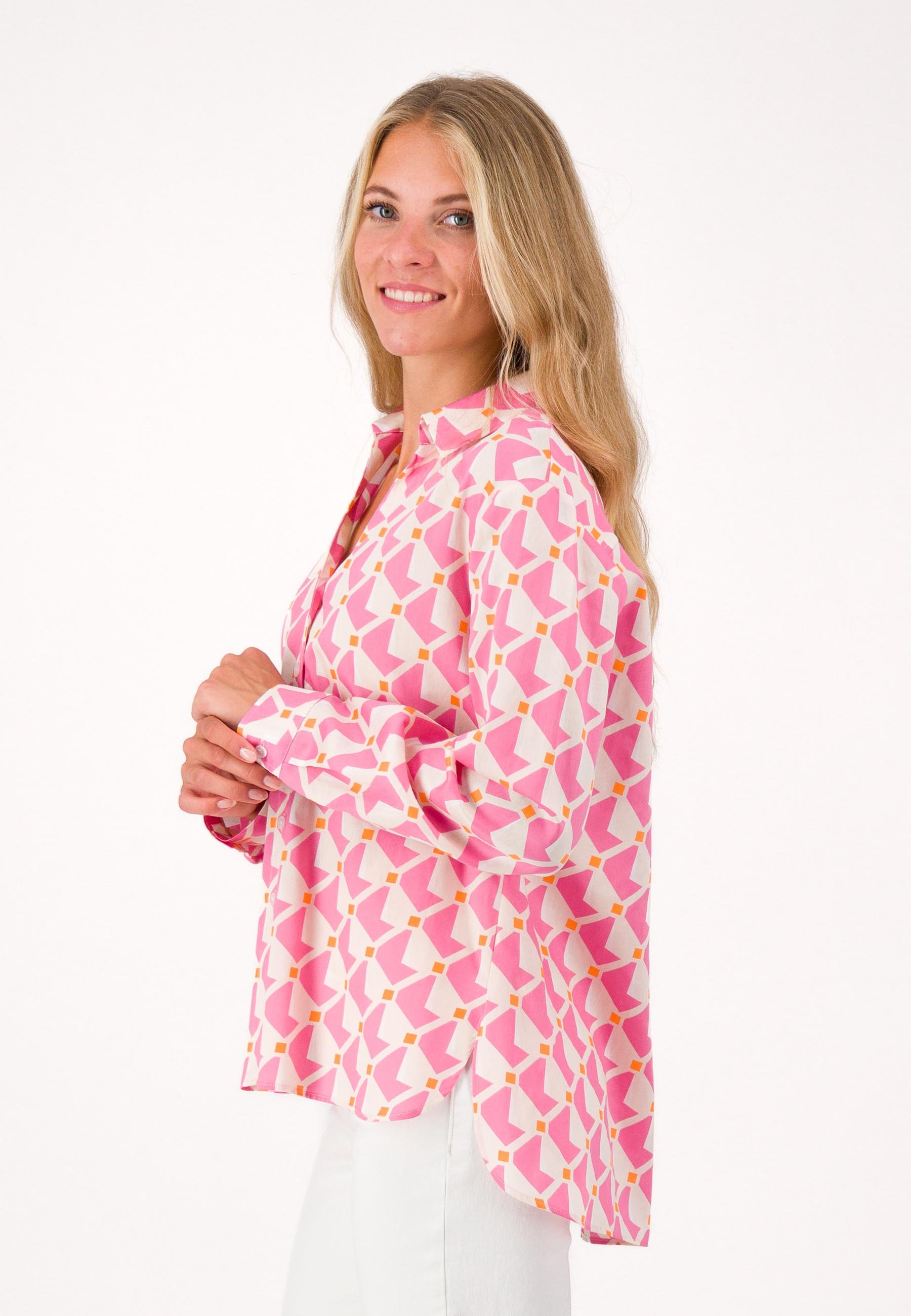 Отличным выбором для летних месяцев станет свободная блуза с отложным воротником и геометрическим узором. Изготовлен из 100% хлопка, удобен в носке и приятен на ощупь. Свободный крой также обеспечивает большую свободу движений и является идеальным выбором, особенно в теплое время года. Сочетайте блузку с блейзером для офисного образа или небрежно с джинсами, в ней вы всегда будете чувствовать себя комфортно.