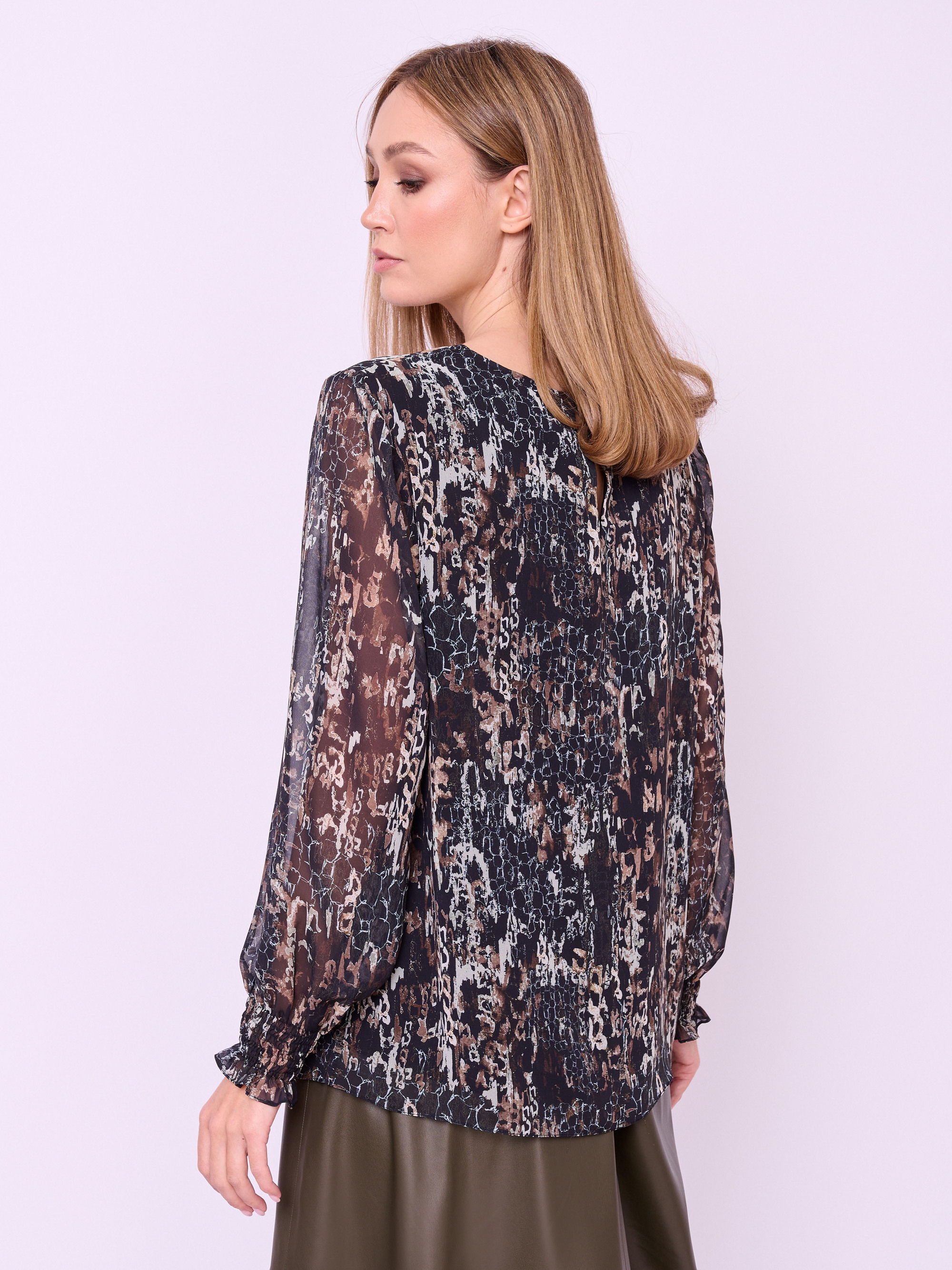 Блуза из шифона с абстрактным рисунком свободного покроя с округлой горловиной, длинными рукавами на резинке. Длина по спинке: 66 см.