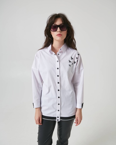 Удлиненная рубашка прямого силуэта с разрезами в боковых швах и ассиметричной линией низа, дизайнерская особенность модели - контрастные элементы: кнопки, декоративная резинка на манжетах, кант по низу и графичный принт в области груди. Перед с двумя вытачками на выпуклость груди, идущими из боковых швов. Застежка на 12 кнопок. Длинные втачные рукава со спущенной линией плеча и манжетами на прорезные петли и пуговицы. Стояче-отложной воротник.